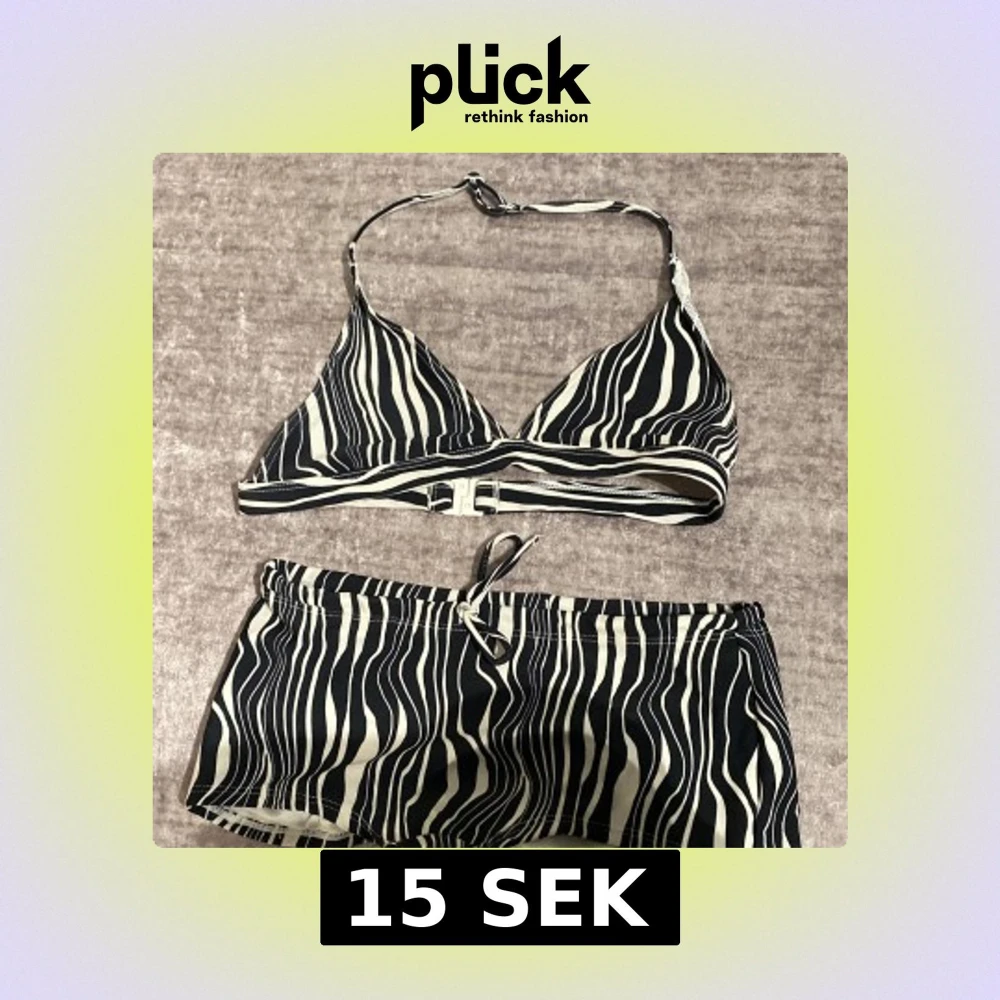 Snygg bikini med zebramönster i svart och vitt. Överdelen har trekantskupor med knyt i nacken och spänne i ryggen. Underdelen är ett par shorts med snörning framtill. Perfekt för strandhäng eller poolparty!