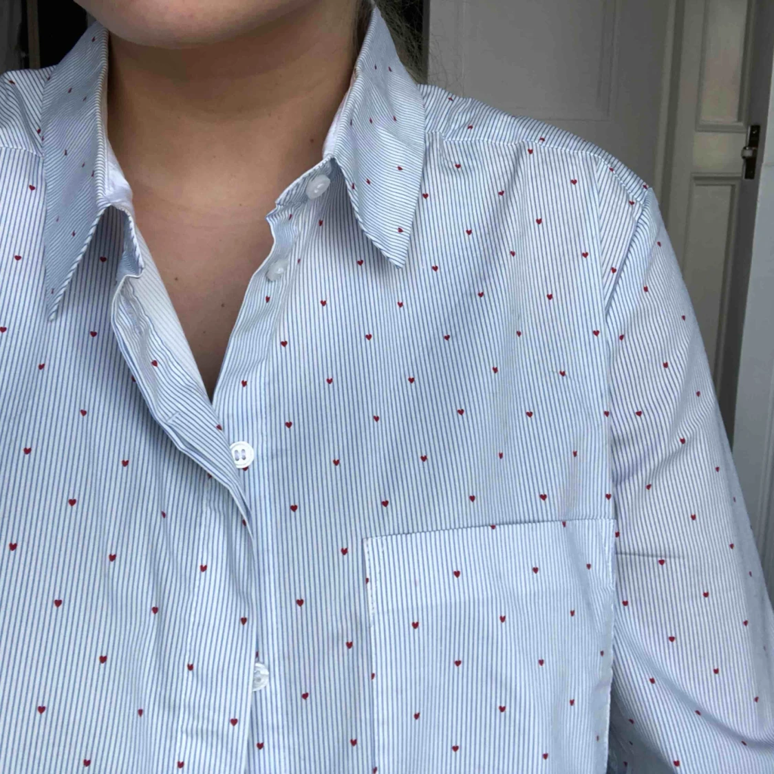 Vitblå randig skjorta med små röda hjärtan, lite oversized på mig som brukar ha S. Supersnygg till allt, särskilt på våren/sommaren!