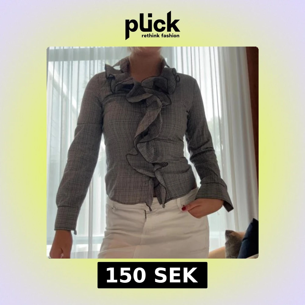 Snygg grå och svart rutig skjorta från NaraCamicie med volangdetalj längs knäppningen och kragen. Skjortan har lång ärm och figurnära passform, perfekt för dig som gillar en stilren men ändå unik look.