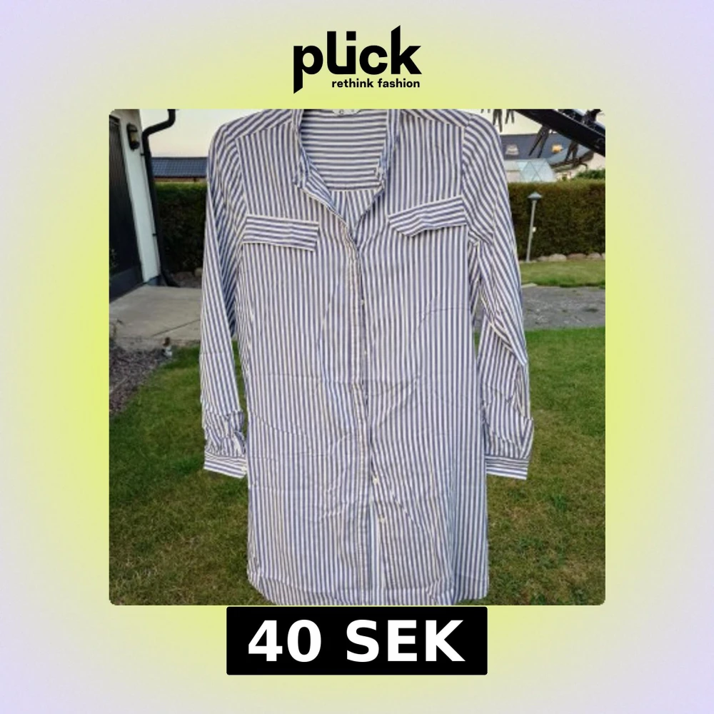 Snygg lång skjorta från C i storlek 36 med blå och vita vertikala ränder. Skjortan har knappar hela vägen, två bröstfickor med lock och klassisk krage. Långärmad och tillverkad i mjuk bomull, perfekt för en chill och stilren look.