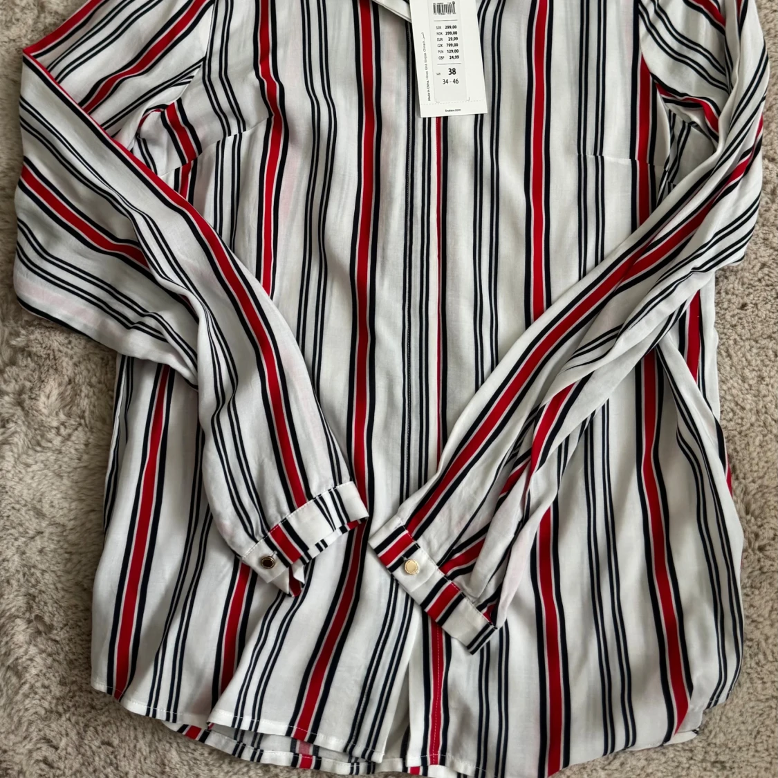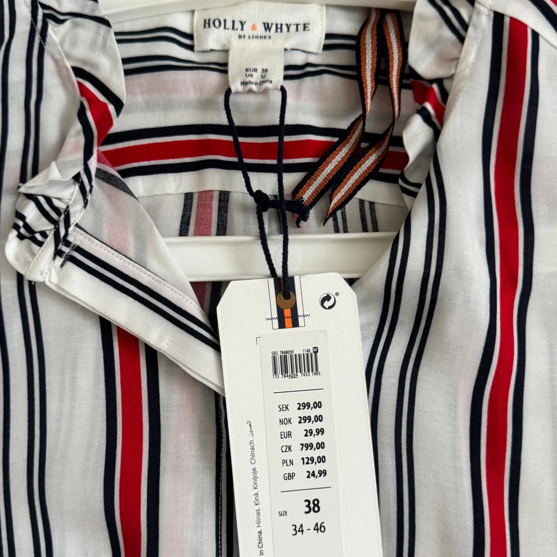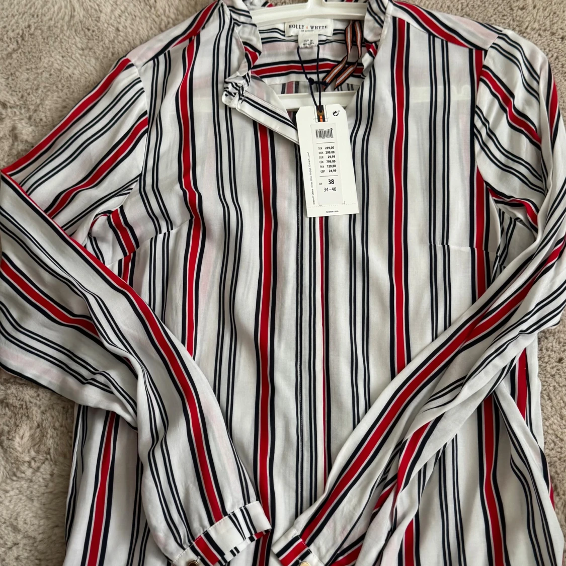 Snygg skjorta med vertikala ränder i vitt, svart och rött från Holly & Whyte. Modellen har lång ärm med knappar vid manschetten och klassisk krage. Skjortan är gjord i mjuk bomull och har en relaxed passform som är enkel att styla till jeans eller kjol.