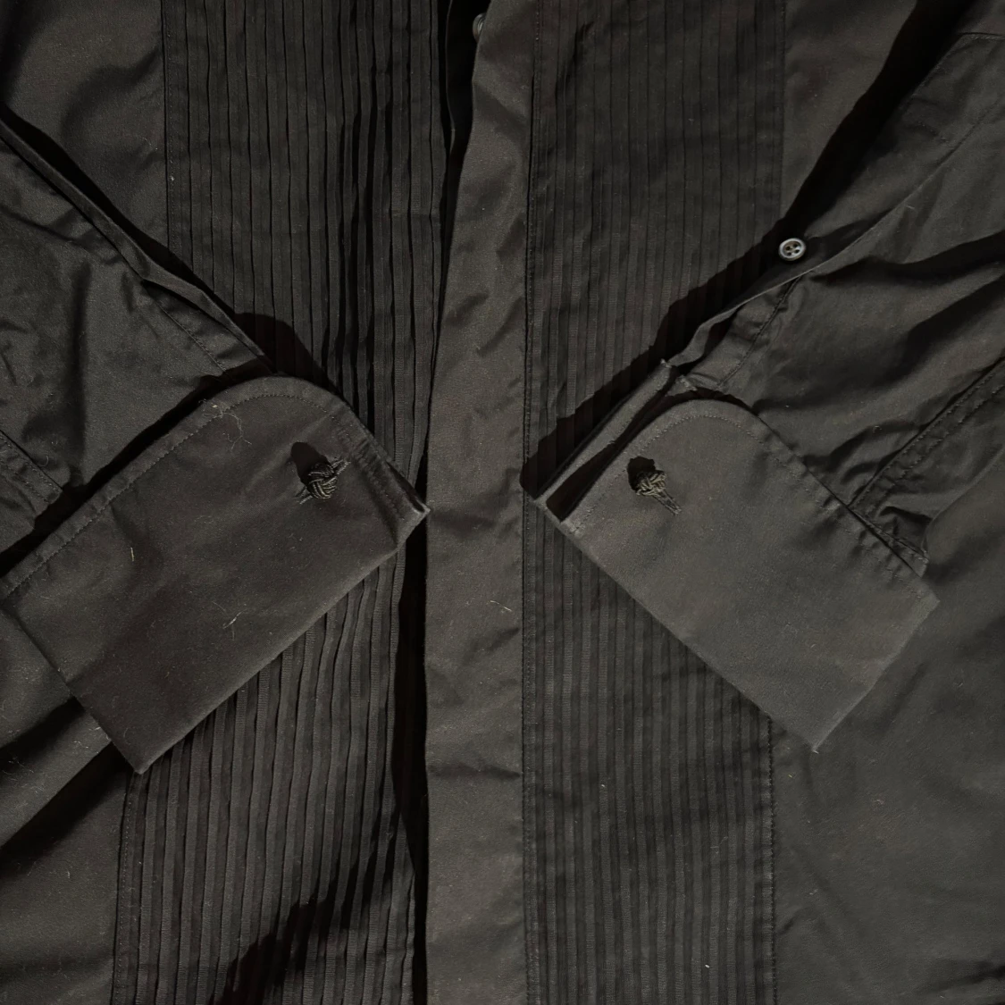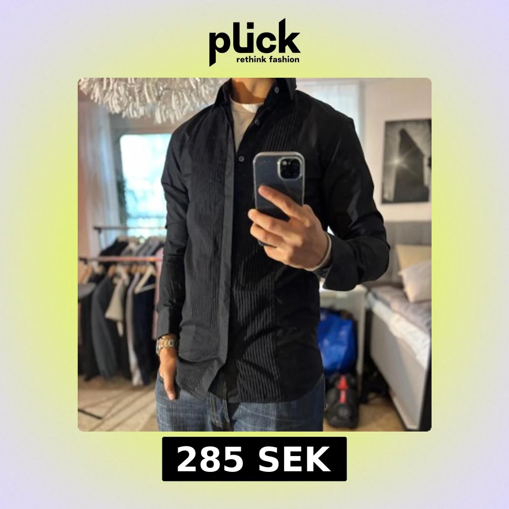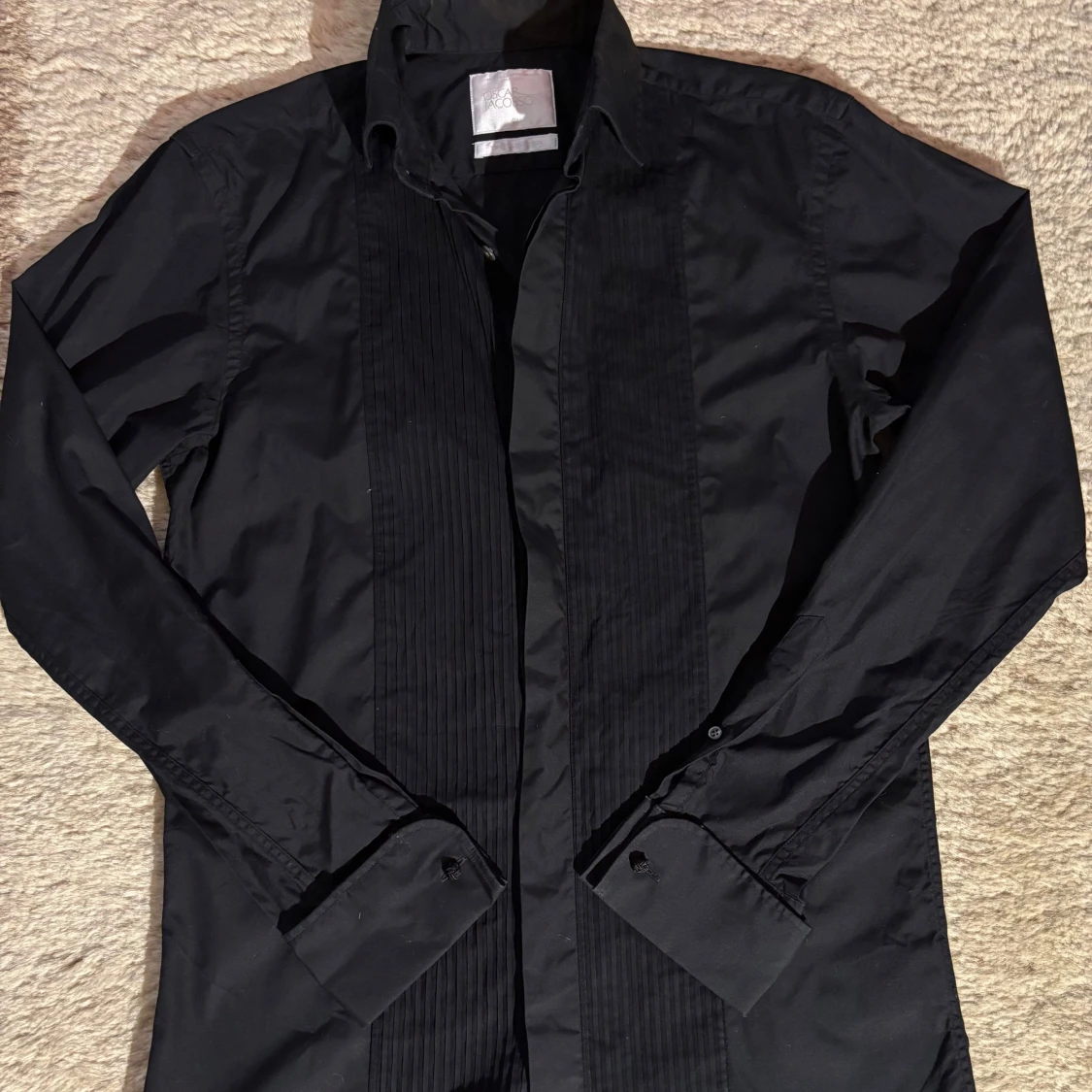 Säljer en svart skjorta från Oscar Jacobson i bomull. Skjortan har snygga veckade detaljer framtill, klassisk krage och långa ärmar med breda manschetter. Perfekt för dig som vill ha en stilren och dressad look.