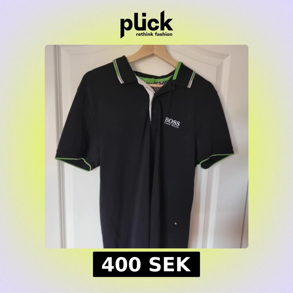 Säljer en svart pikétröja från BOSS med vit logga på bröstet och nacken. Tröjan har gröna detaljer på krage och ärmslut.
