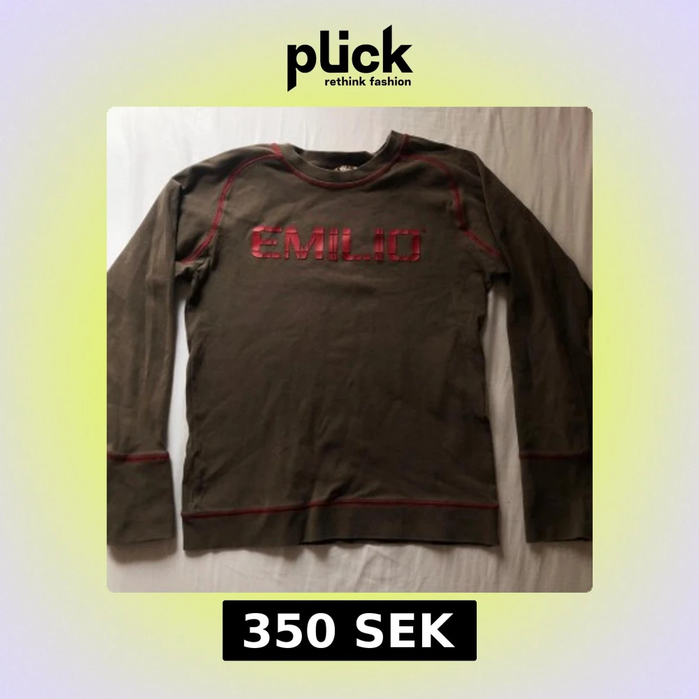 Säljer en brun/grön långärmad tröja från Emilio med röda sömmar och tryckt röd logga på bröstet.