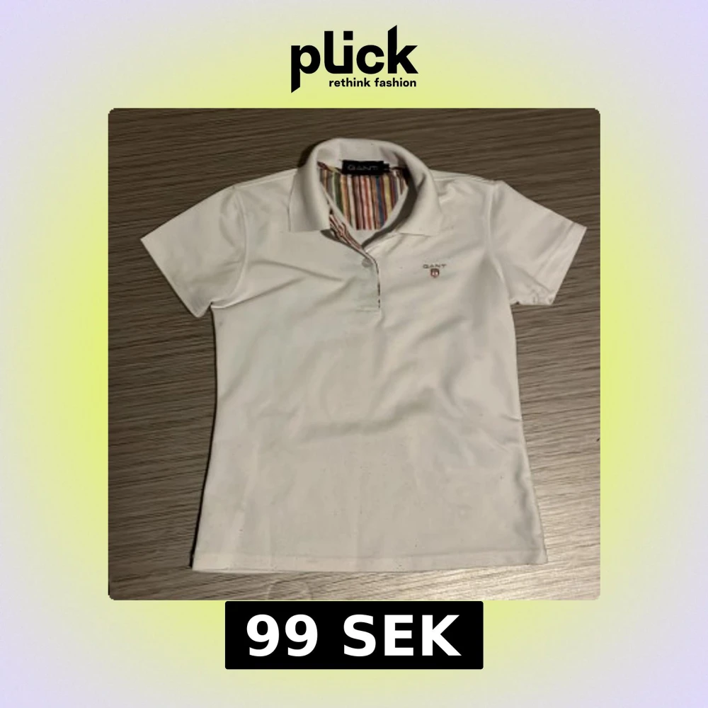 Vit pikétröja från Gant med klassisk krage och korta ärmar. Insidan av kragen har färgglada ränder som ger en snygg kontrast. Broderad Gant-logga med sköld på bröstet. Perfekt för en clean och sportig look.