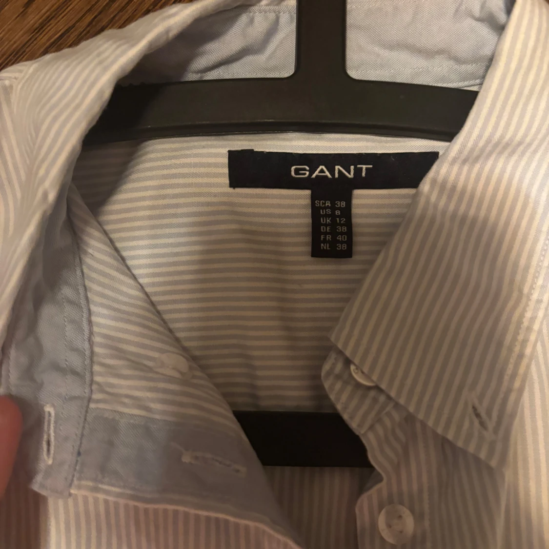 Klassisk skjorta från GANT i vitt och ljusblått med tunna ränder. Skjortan har lång ärm, knappar framtill och en liten broderad logga på bröstet. Perfekt för en stilren och tidlös look.