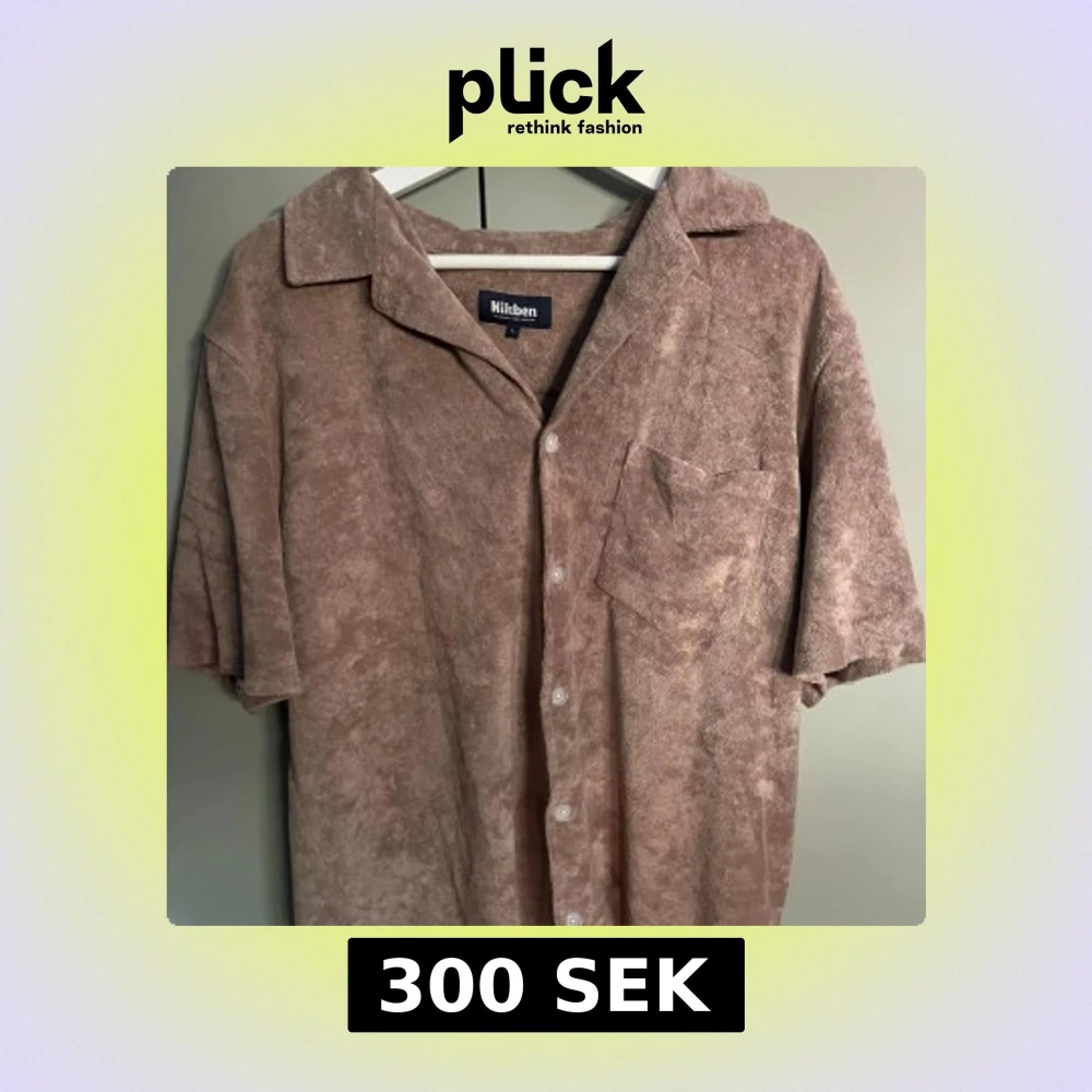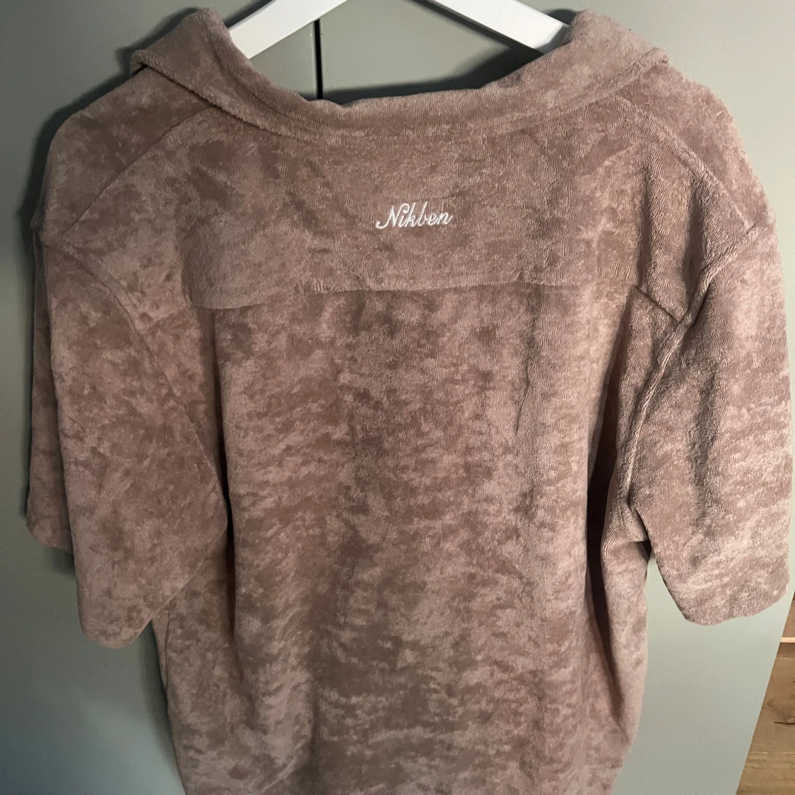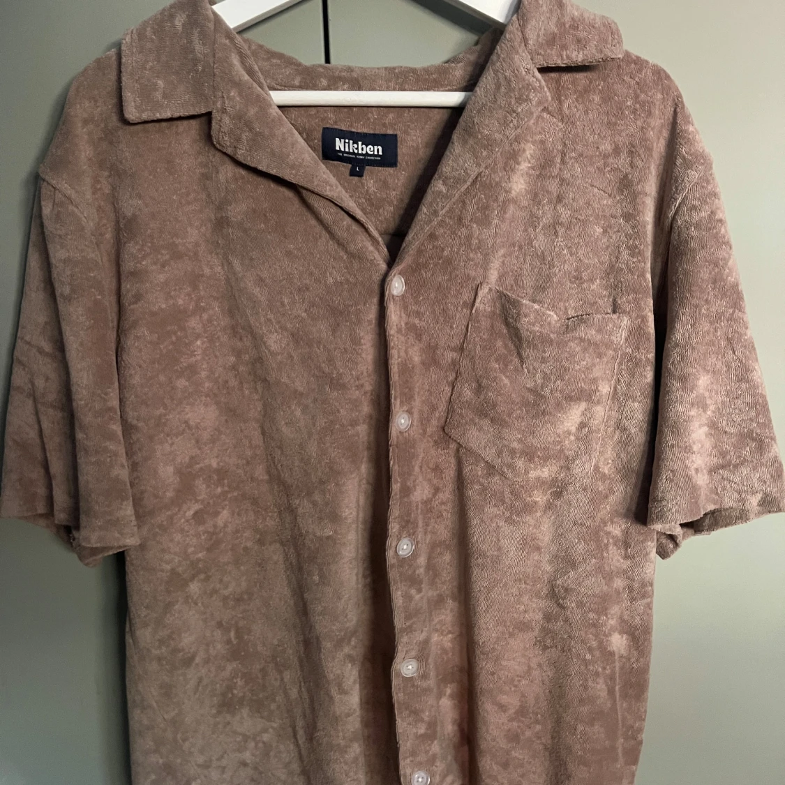 Säljer en beige frottéskjorta från Nikben med korta ärmar och knappar framtill. Skjortan har en bröstficka och en avslappnad krage. Perfekt för en avslappnad stil.