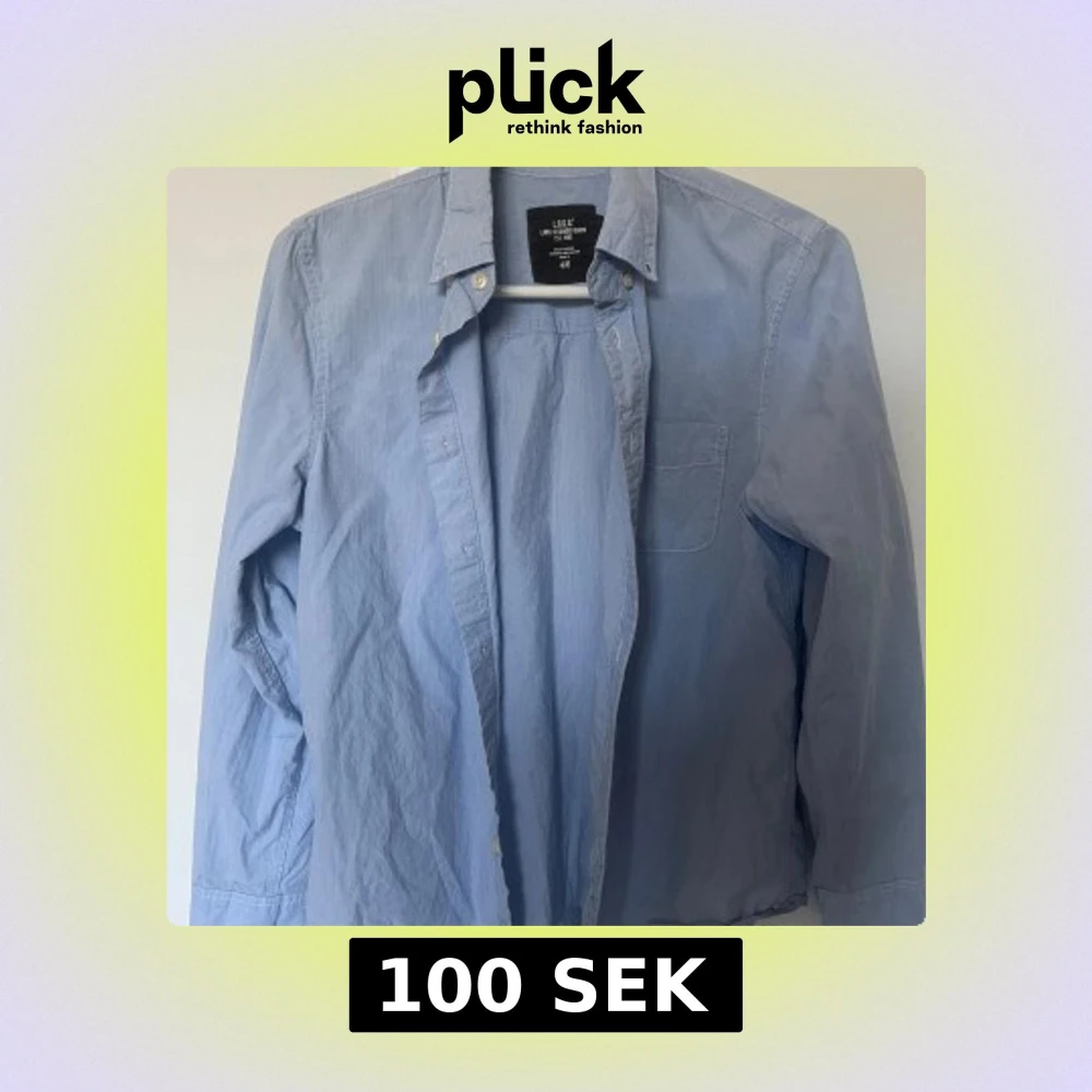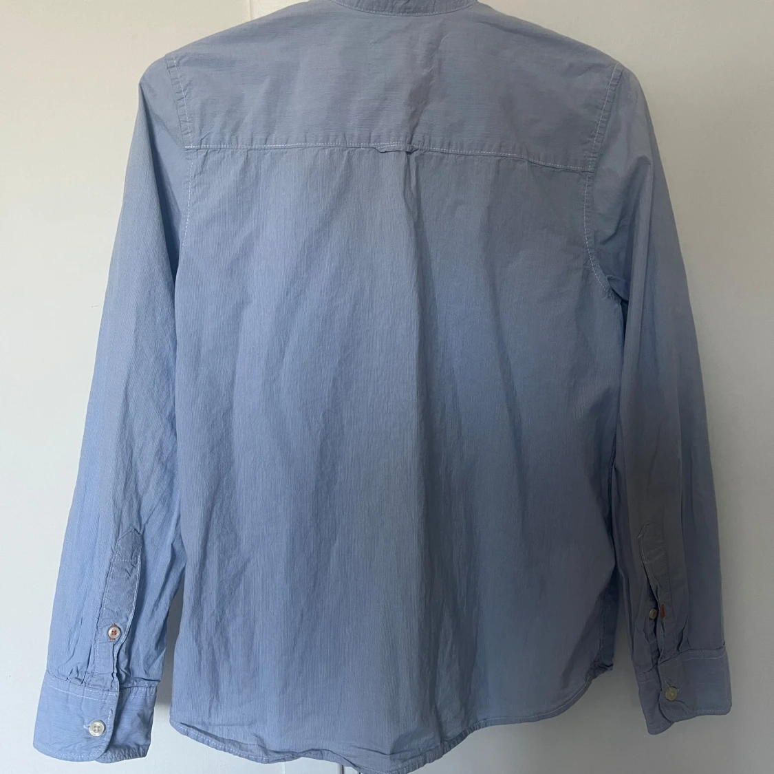 Klassisk ljusblå skjorta med diskreta ränder från L.O.G.G. H&M. Skjortan har lång ärm, bröstficka och knäppning framtill. Den är i storlek