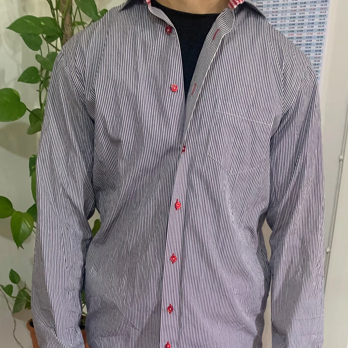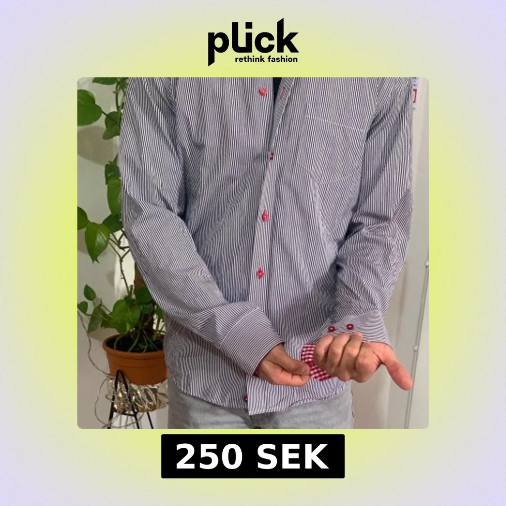 Snygg randig skjorta från Oscar of Sweden i blått och vitt med röda knappar. Kragen har ett rödvitt rutigt mönster på insidan som ger en cool kontrast. Perfekt för en stilren look!