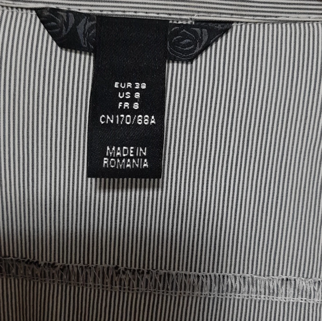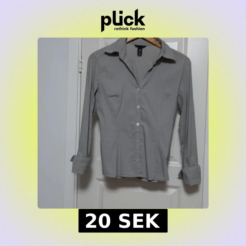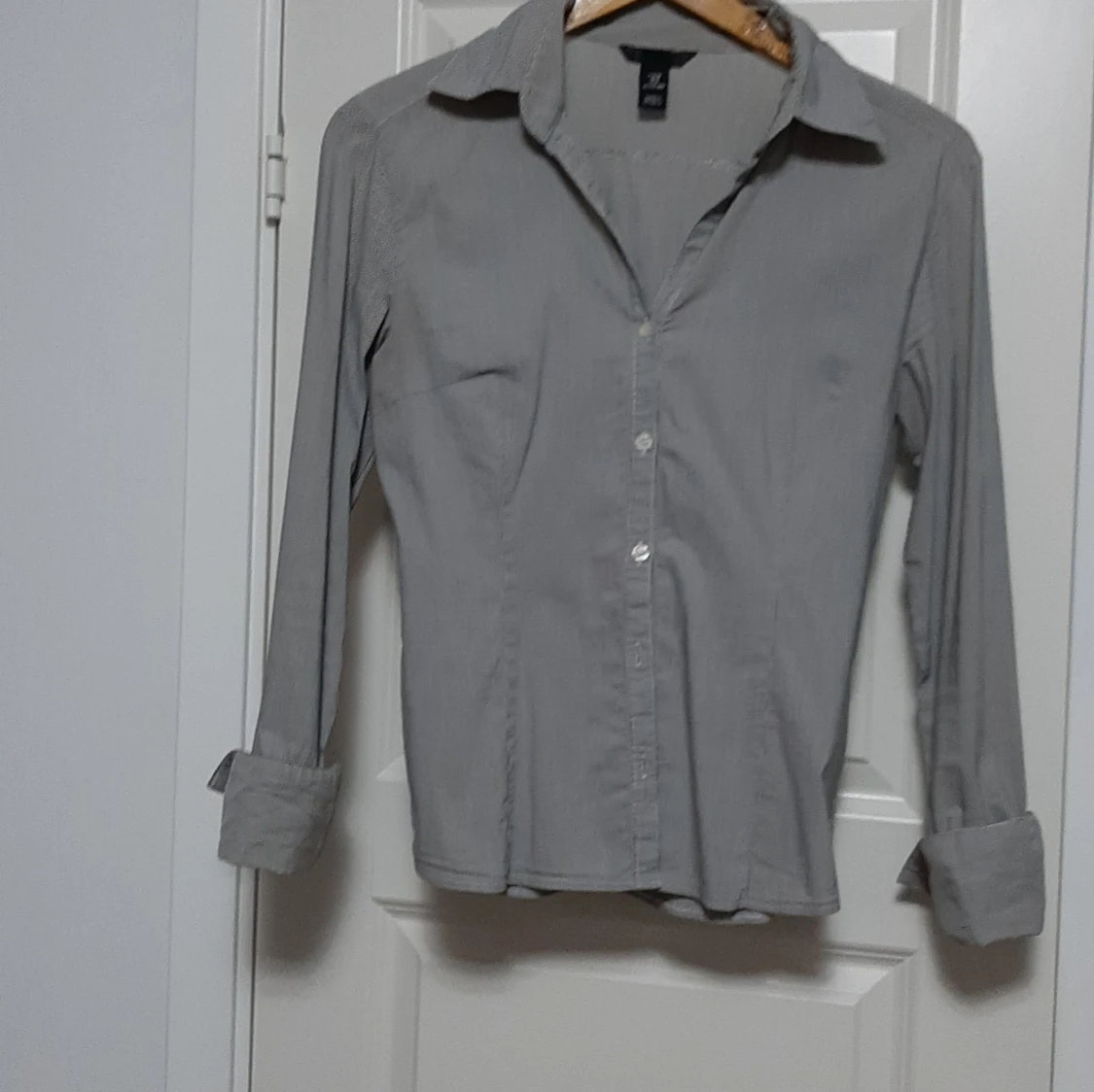 Klassisk skjorta från H&M i storlek 38 med smala grå och vita ränder. Skjortan har lång ärm, knappar framtill och en snygg krage. Tillverkad i bomull, perfekt för en clean och stilren look.