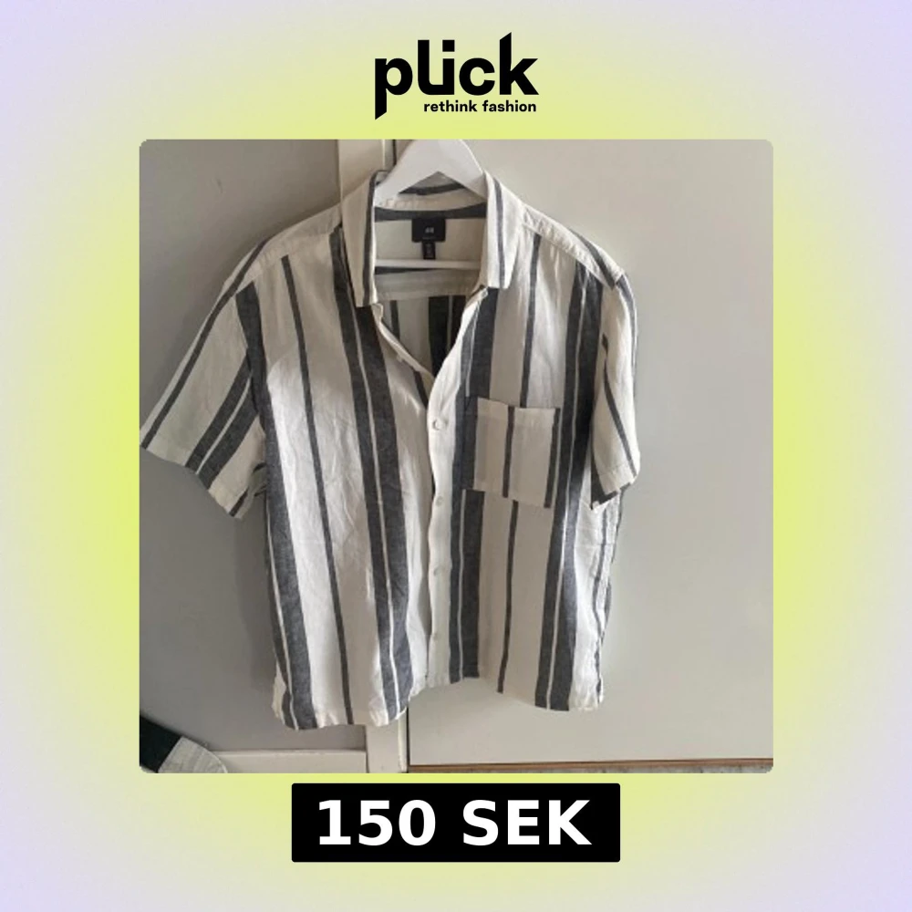 Säljer en vit och mörkgrå randig skjorta från H&M i regular fit. Skjortan är kortärmad, har knappar framtill och en bröstficka. Perfekt för varma dagar och enkel att styla med jeans eller shorts, använt 3 gånger