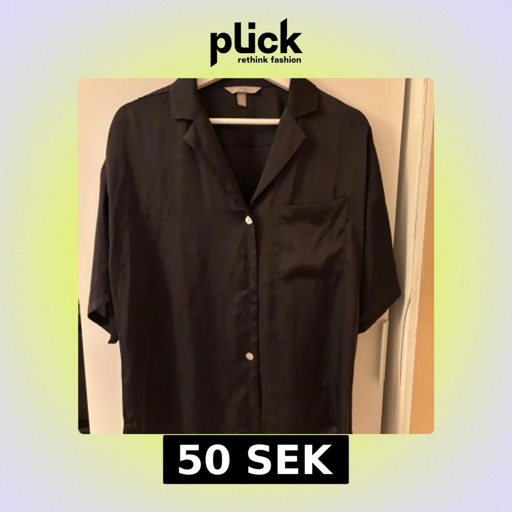 Säljer en svart satin-skjorta från H&M i storlek S. Skjortan har korta ärmar, klassisk krage, knäppning framtill och en bröstficka. Tillverkad i 100% polyester vilket ger en lätt och mjuk känsla.