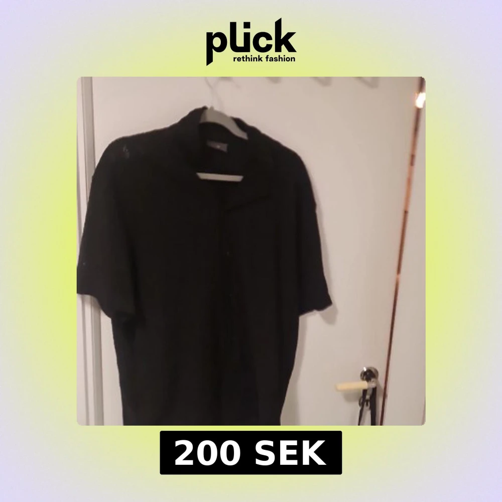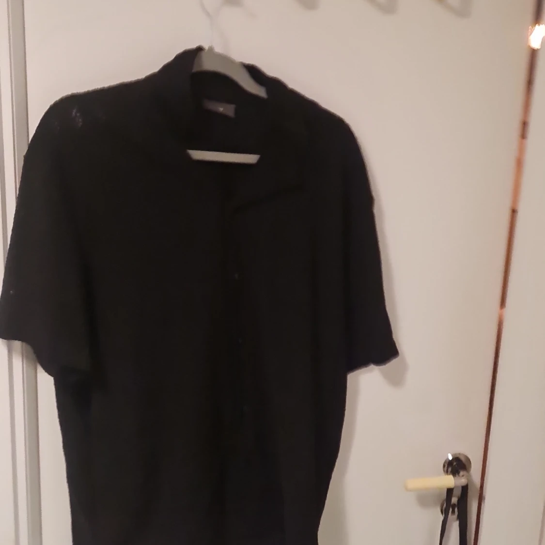 Säljer en svart kortärmad skjorta från H&M med regular fit. Skjortan har ett diskret mönster och knappar framtill. Perfekt för en stilren look.