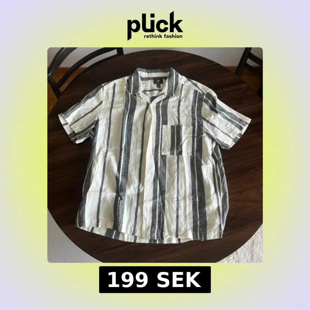 Snygg kortärmad skjorta från H&M i storlek M. Skjortan är vit med breda svarta ränder, har klassisk krage, bröstficka och knäppning framtill. Tillverkad i luftig linneblandning, perfekt för varma dagar. Regular fit för en avslappnad stil.