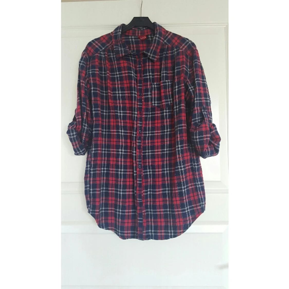 En längre rutig skjorta. en bröstficka. köpt på hm.