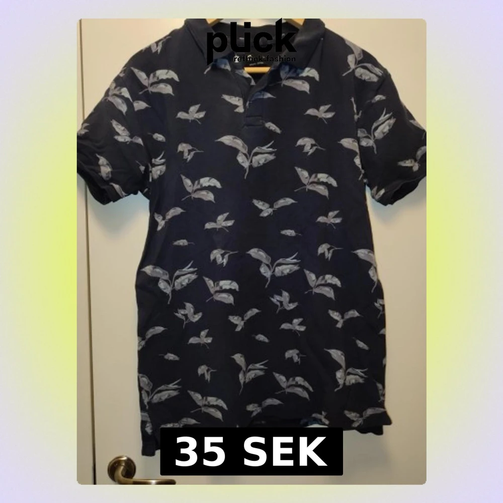 Snygg mörkblå pikétröja från C i storlek L, tillverkad i ekologisk bomull. Skjortan har korta ärmar, krage och knappar framtill. Blommigt mönster i ljusare toner ger en fräsch och avslappnad vibe.