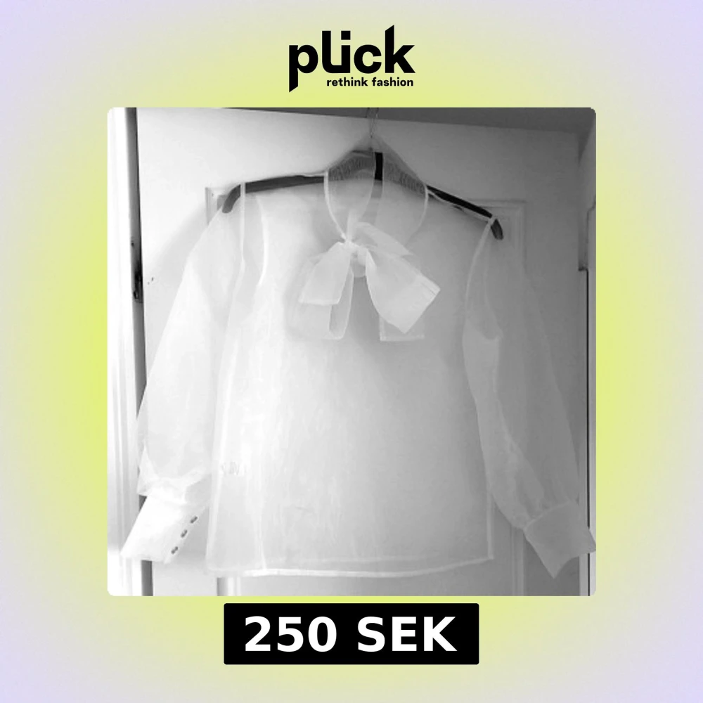 Säljer en superfin vit transparent blus i tunn organza med stor rosett i halsen. Blusen har långa ärmar med breda manschetter och silvriga knappar. Perfekt för dig som vill sticka ut med en trendig och luftig look.