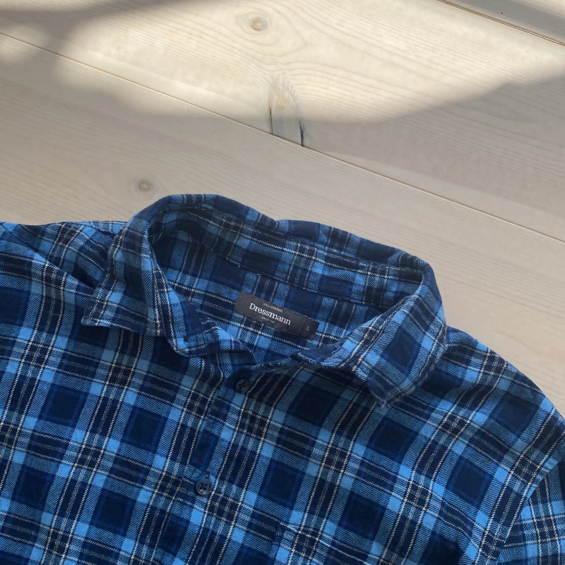 Blåa flanellskjorta från dressman, endast testad. Storlek L.