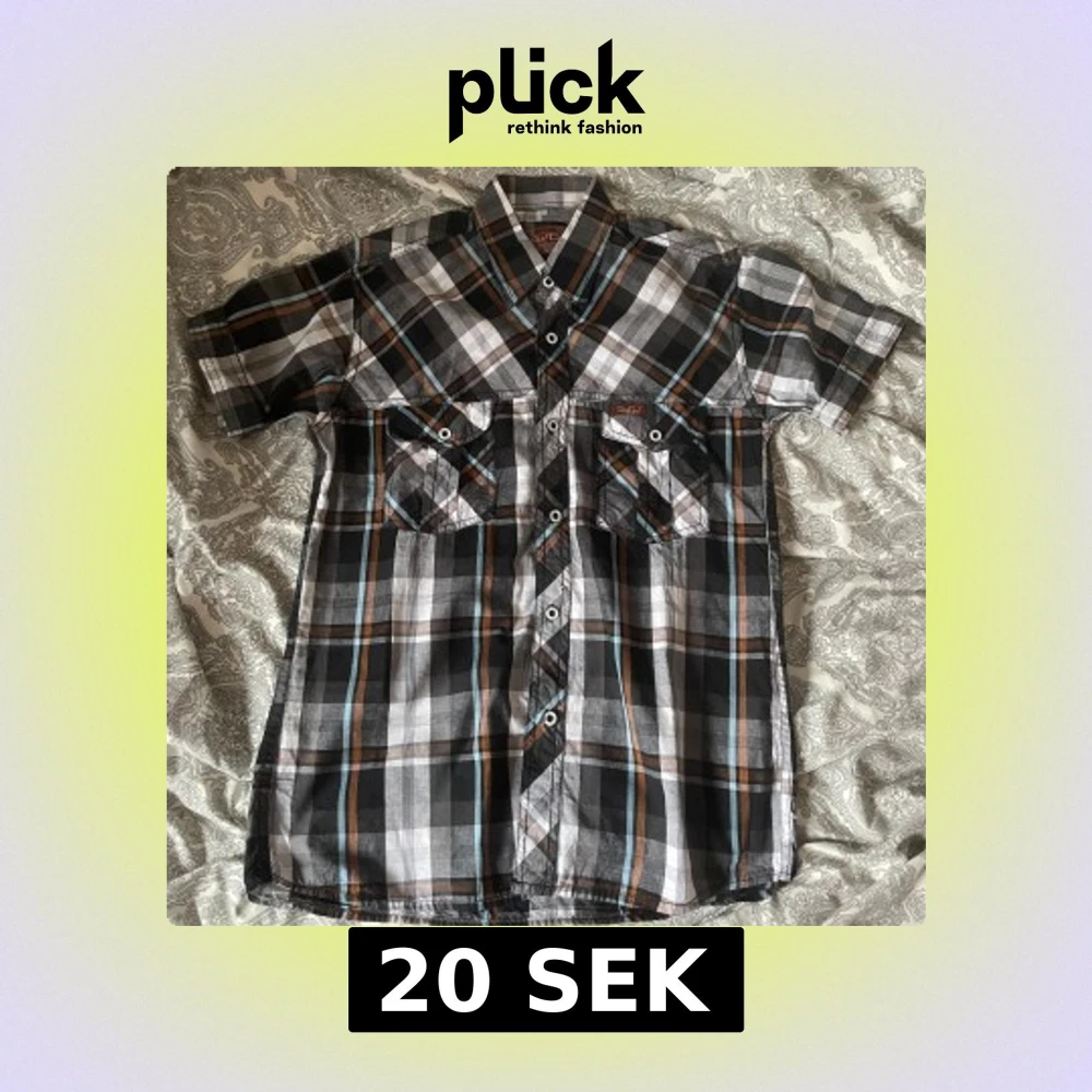 Snygg rutig skjorta i svart, vit, brun och blå. Skjortan har korta ärmar, två bröstfickor med knappar och klassisk krage. Perfekt för dig som gillar en avslappnad men ändå stilren look. Storleken är L men skulle säga att den sitter mer som en M eller S. Säljer mycket skjortor så köp gärna flera i ett bundle!