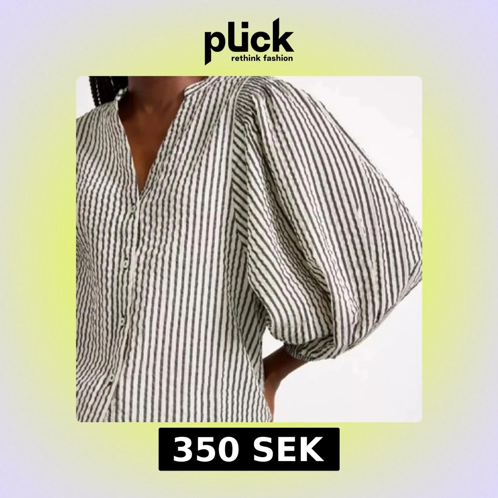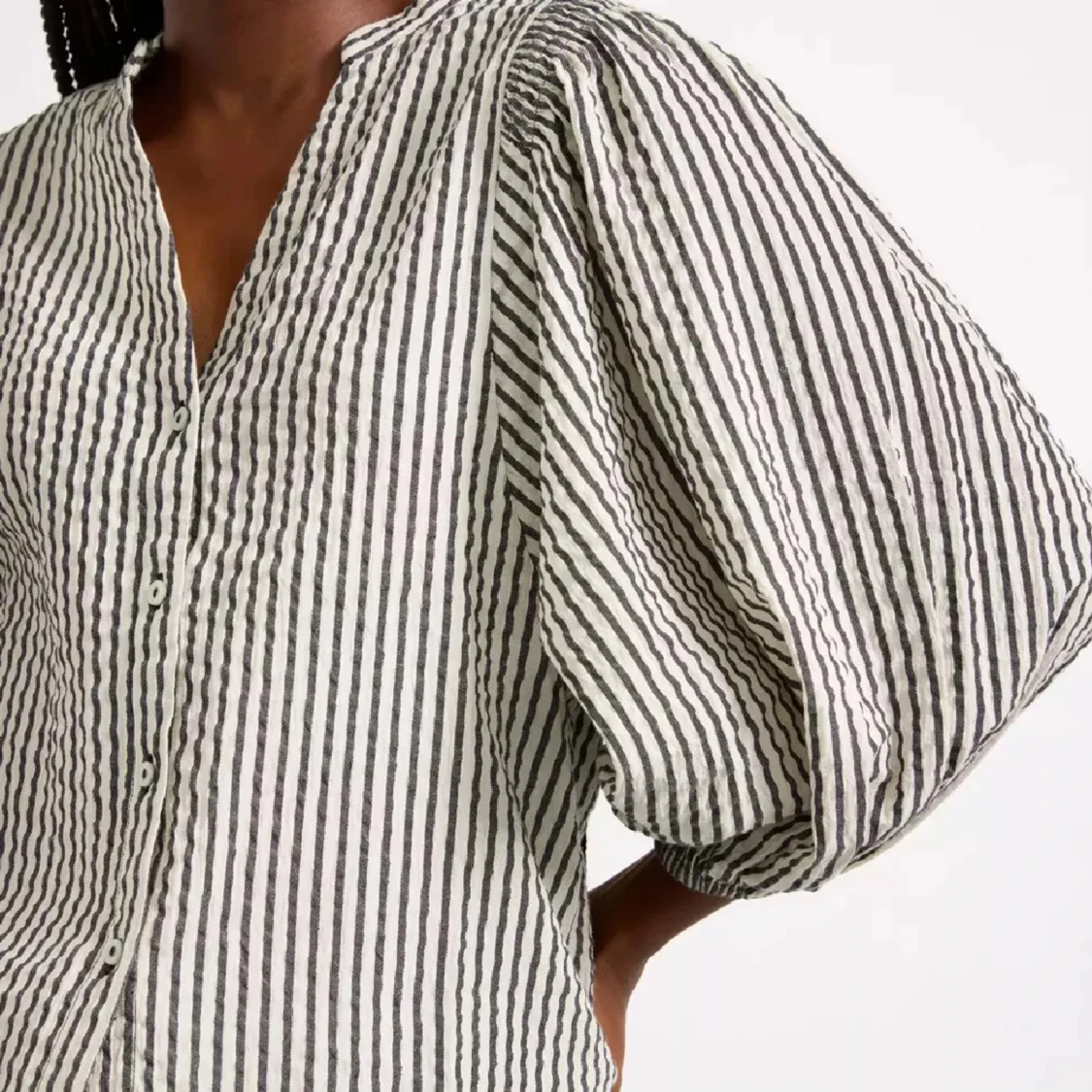 Snygg randig blus från LINDEX i beige och svart med ballongärmar och v-ringning. Aldrig använd