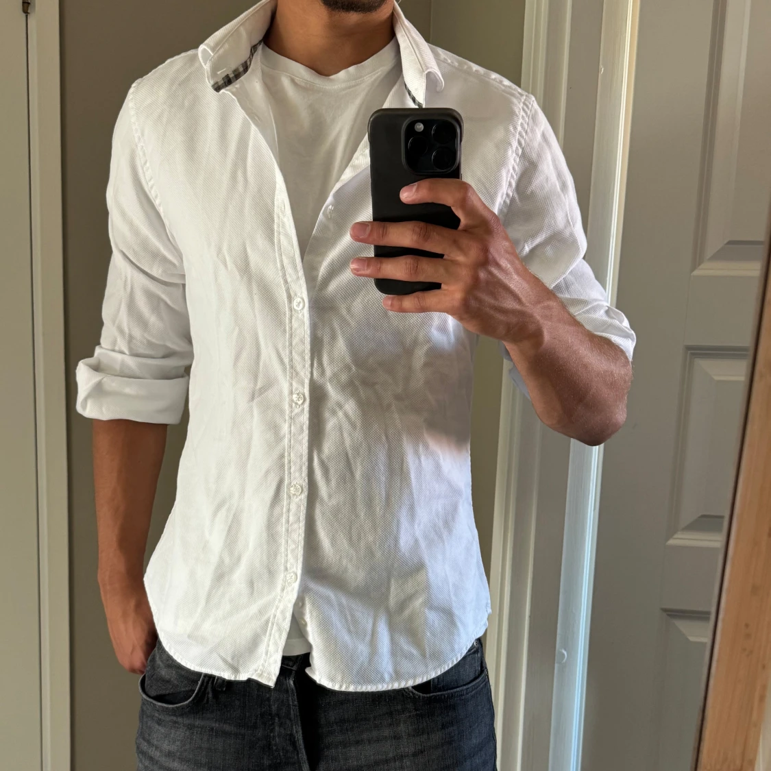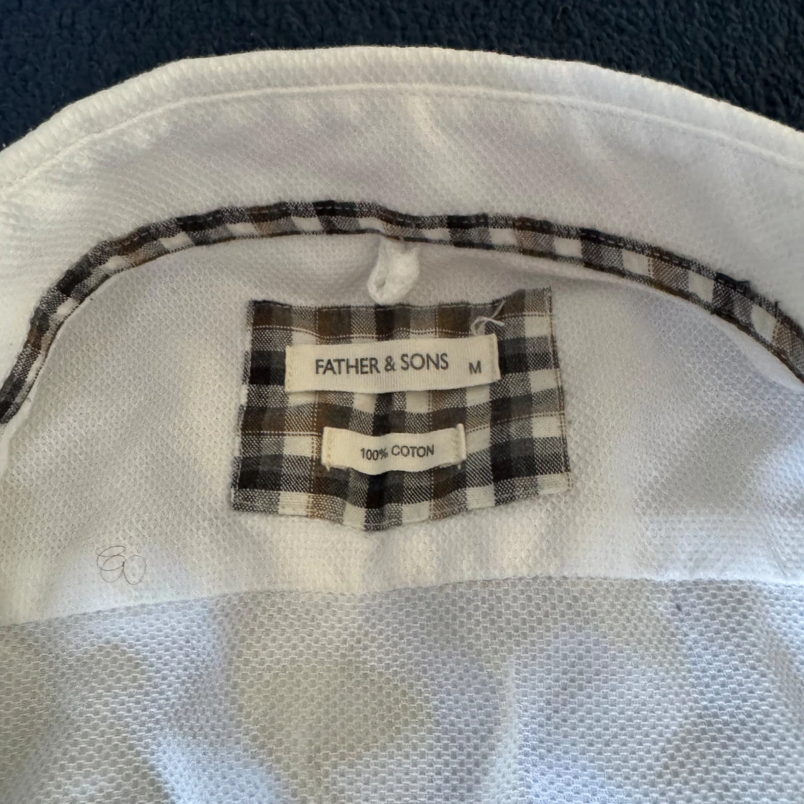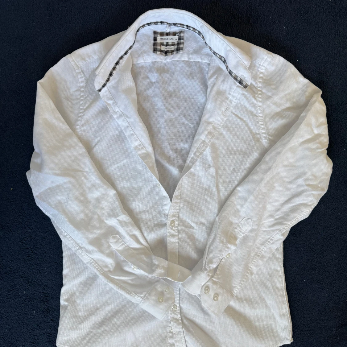 Klassisk vit skjorta från Father & Sons i 100% bomull. Skjortan har lång ärm. Väldigt unikt material och väldigt bra skick. Storlek M. Tveka inte att skriva vid funderingar 💯