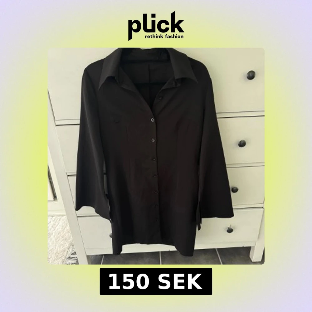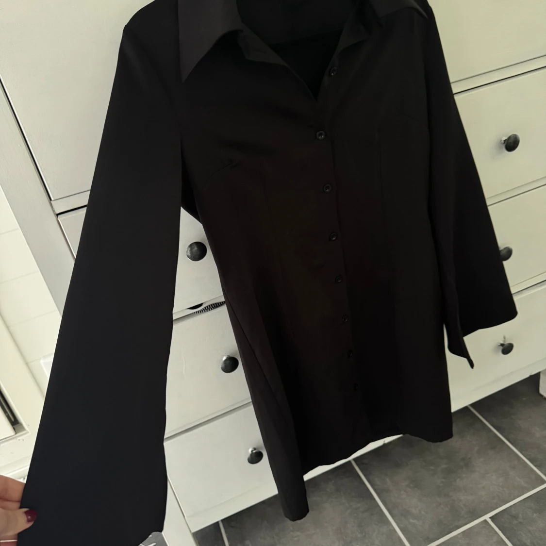 Stilren svart skjortklänning med lång ärm och klassisk krage. Skjortklänningen har vida ärmar och knäppning hela vägen framtill. Perfekt för dig som gillar minimalistisk och clean stil. Materialet känns mjukt och följsamt mot kroppen.