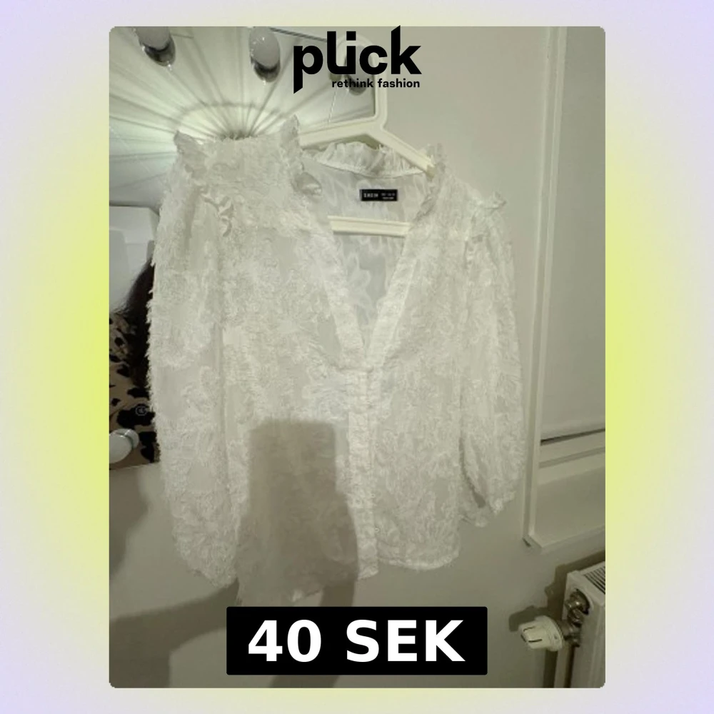 Supersöt vit blus från SHEIN med transparent spets och fluffiga broderade detaljer. Blusen har volanger vid axlarna, v-ringad hals och knappar framtill. Lätt puffiga långärmar och ett romantiskt uttryck som sticker ut. Perfekt för dig som gillar unika plagg med mycket detaljer.