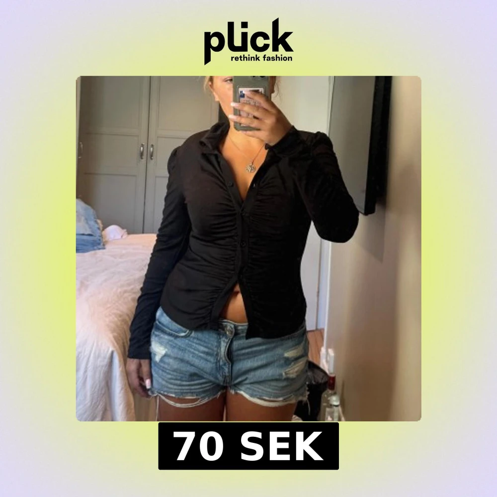 Snygg svart skjorta från SHEIN i storlek M. Modellen har lång ärm, klassisk krage och knappar framtill. Skjortan har en cool rynkad detalj längs knappraden som ger en trendig look. Materialet känns mjukt och stretchigt, perfekt för att styla med jeans eller kjol.