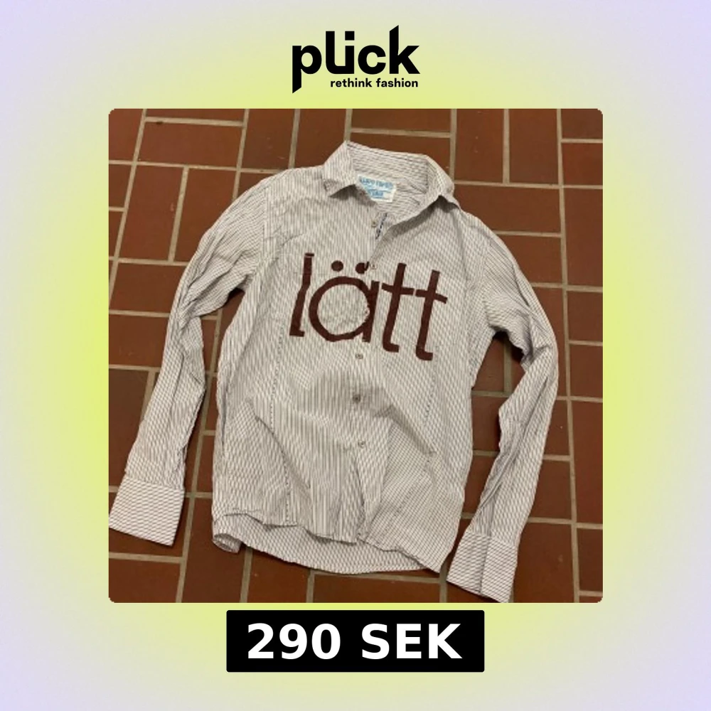 Säljer en randig skjorta med bruna ränder och ett stort tryck med texten 'lätt' på framsidan. Skjortan har långa ärmar och en klassisk krage. Perfekt för en avslappnad stil.