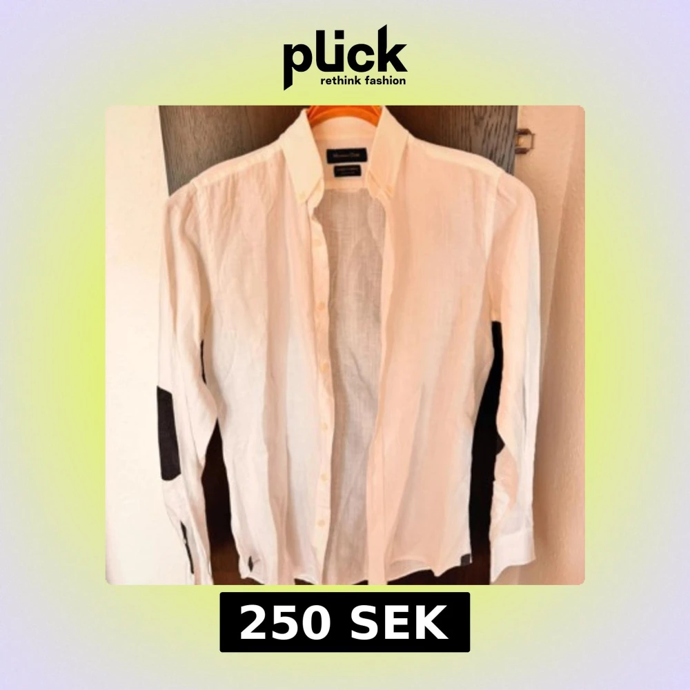 Vit skjorta från Massimo Dutti i svalt linne med klassisk krage och svarta armbågslappar. Långärmad modell med knappar framtill, perfekt för en clean och stilren look. Snygg detalj med kontrast på armbågarna.