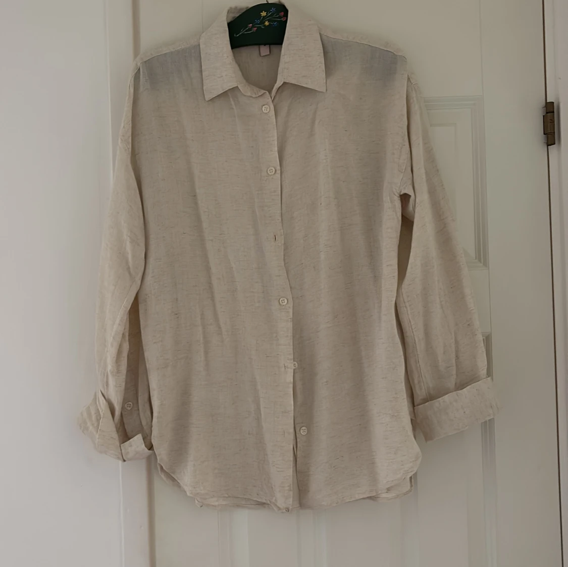 Stilren beige skjorta i linne med klassisk krage och knäppning framtill. Skjortan har långa ärmar som kan vikas upp för en avslappnad look. Perfekt för dig som gillar en enkel och tidlös stil.