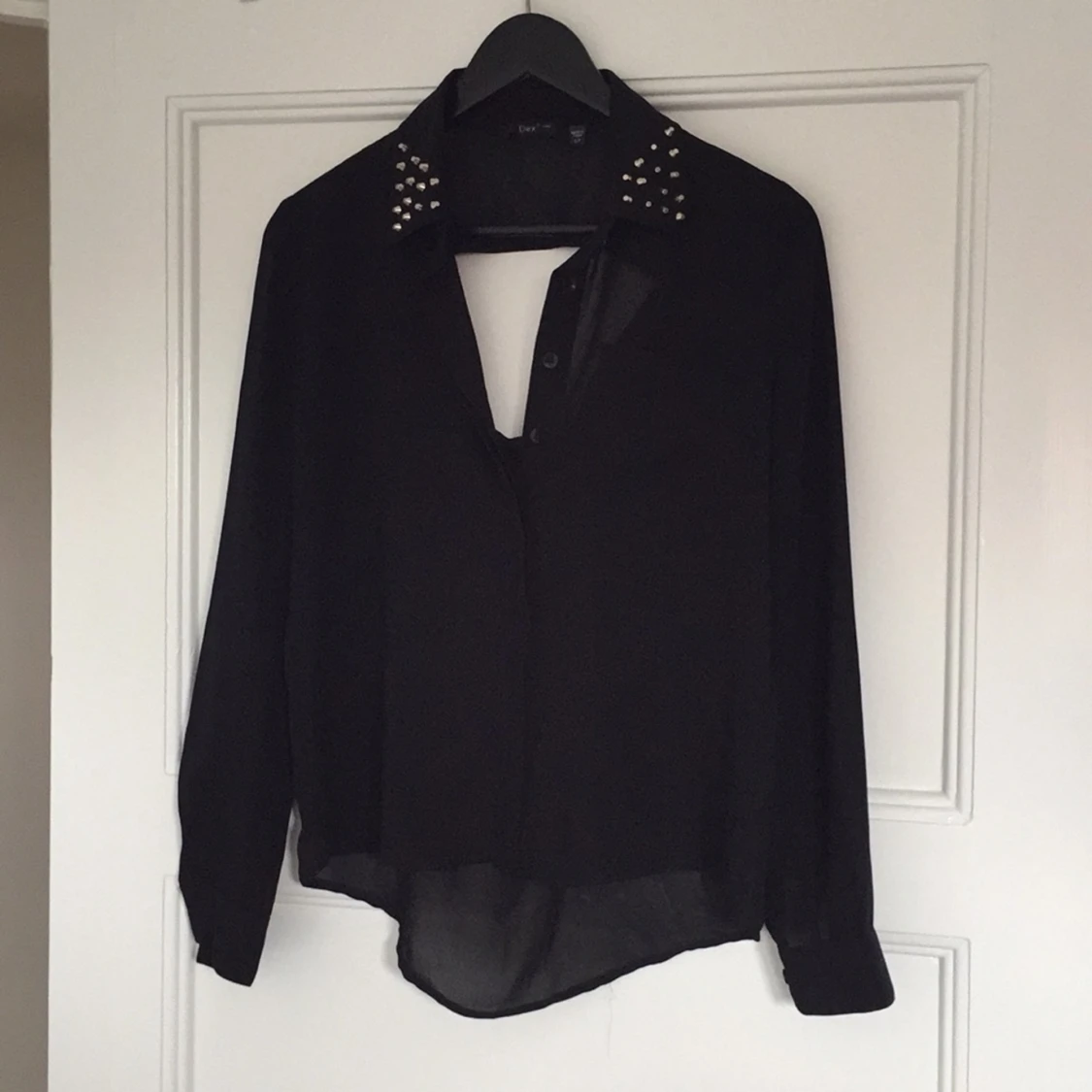 Svart blus med nitar på kragen. Öppen rygg bak (se bild) samt knäppning fram. Köpt i New York.