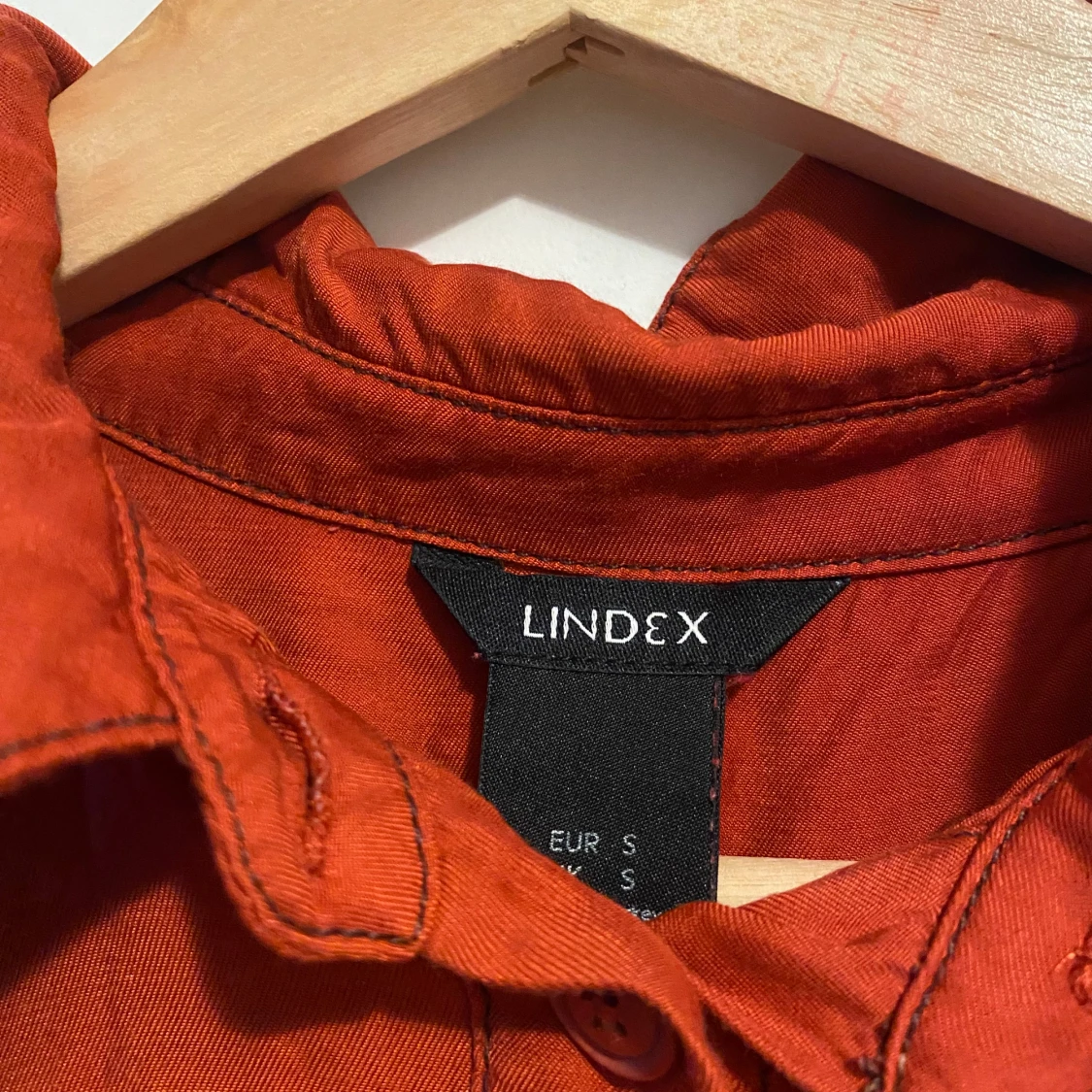 Snygg rostfärgad skjorta från Lindex i 100% viskos. Skjortan har långa ärmar och silklinkade känsla. Perfekt för en stilren look med knappar framtill och klassisk krage. Strl s-m