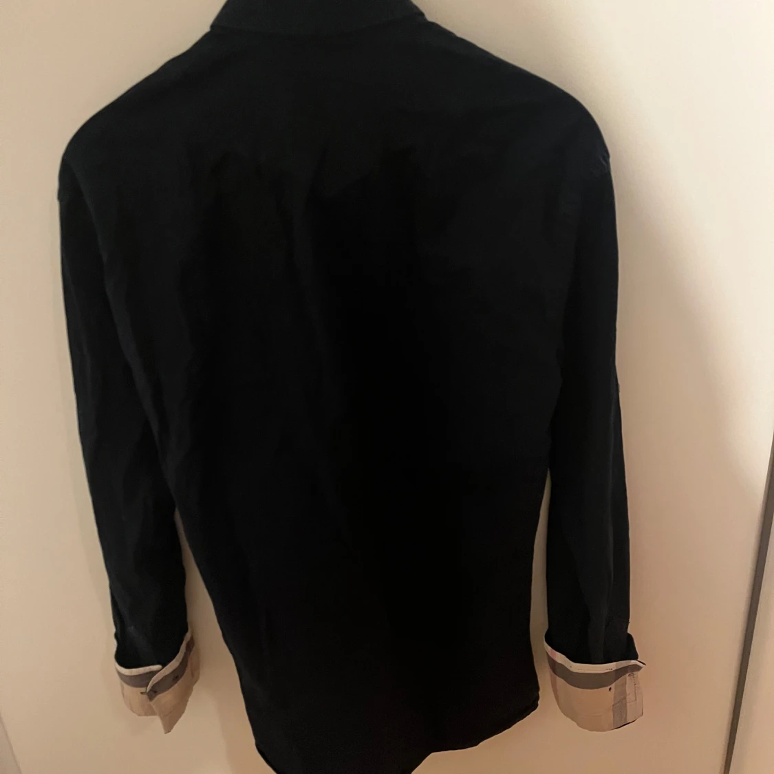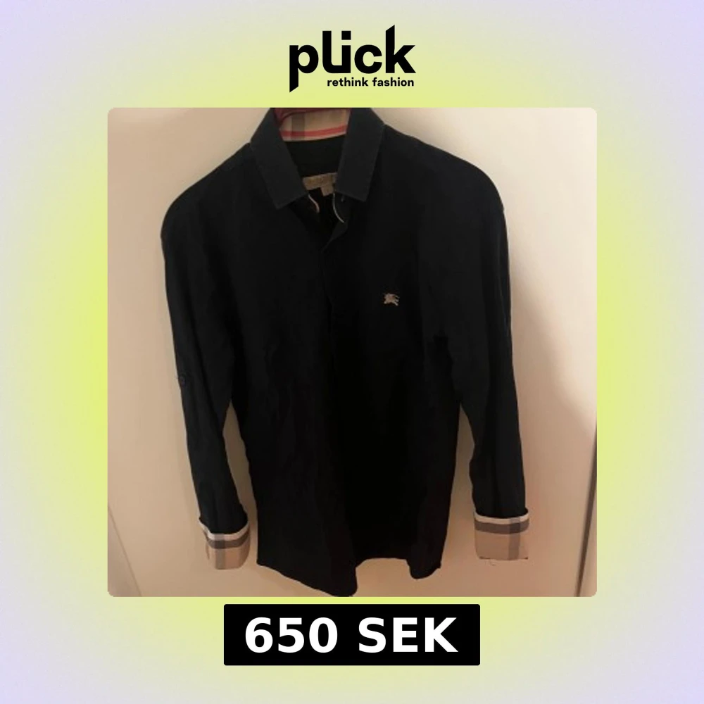 Snygg svart skjorta från Burberry London i storlek S. Klassisk design med långa ärmar och knappar framtill. Ikonisk Burberry-logga broderad på bröstet och typiska rutiga detaljer vid ärmsluten. Perfekt för dig som gillar stilrena plagg med lyxig touch.