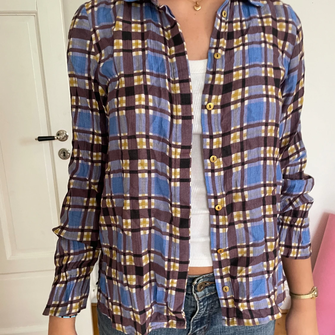 Säljer en rutig skjorta i blått, brunt och gult med klassisk krage och knappar framtill. Skjortan har långa ärmar och är tillverkad i ett mjukt bomullstyg. Perfekt att styla öppen över ett linne eller stängd som den är.