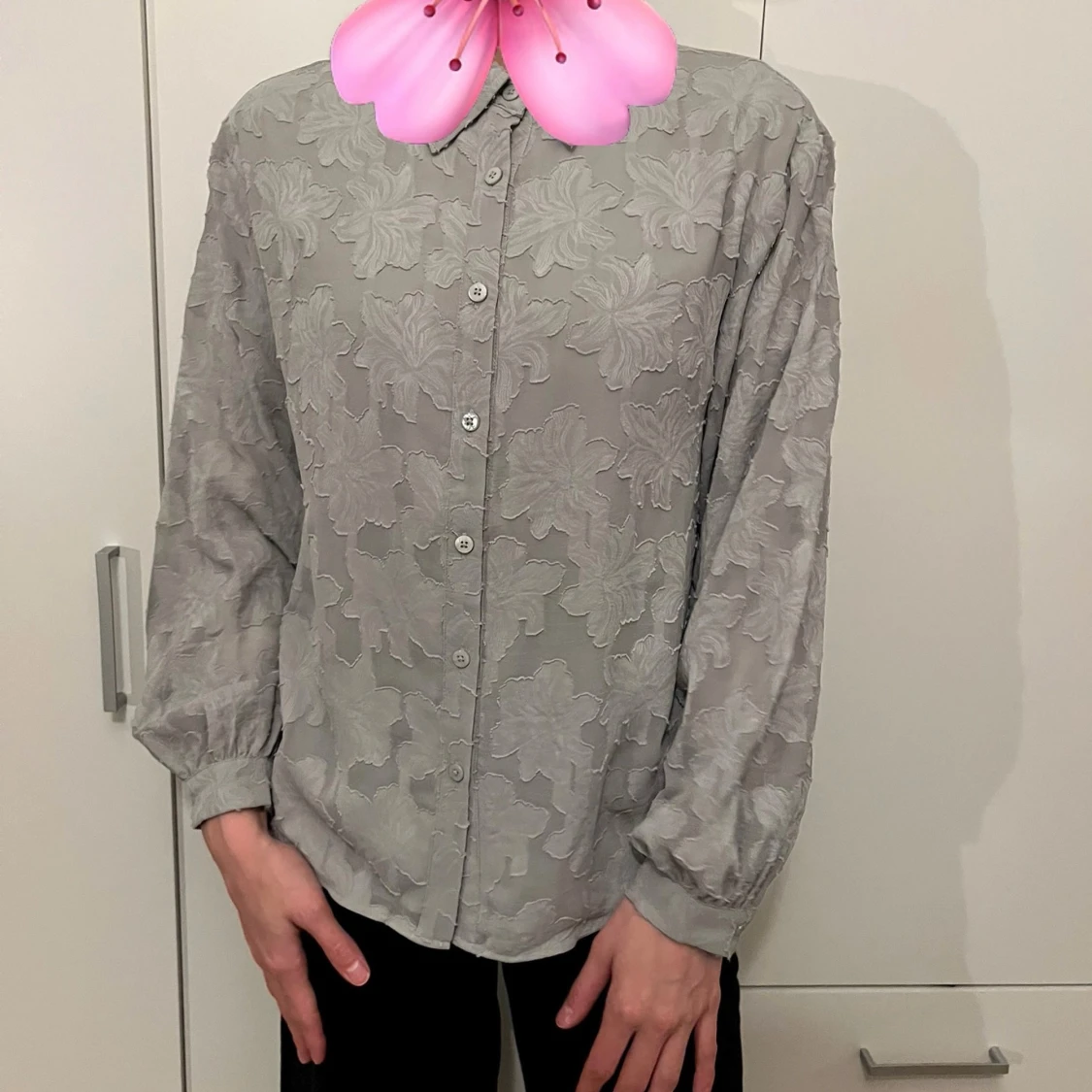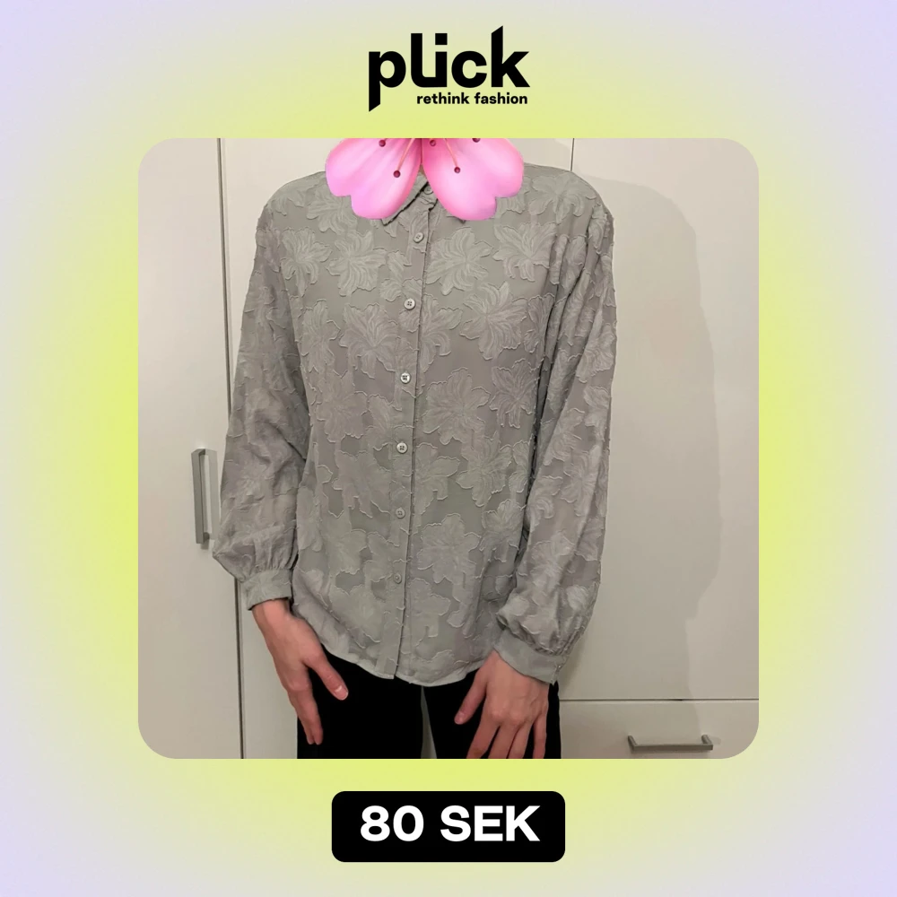 Säljer en elegant grå blus med blommigt mönster. Den har långa ärmar och knappar framtill. Perfekt för både vardag och festliga tillfällen. Passar bra till både jeans och kjol!