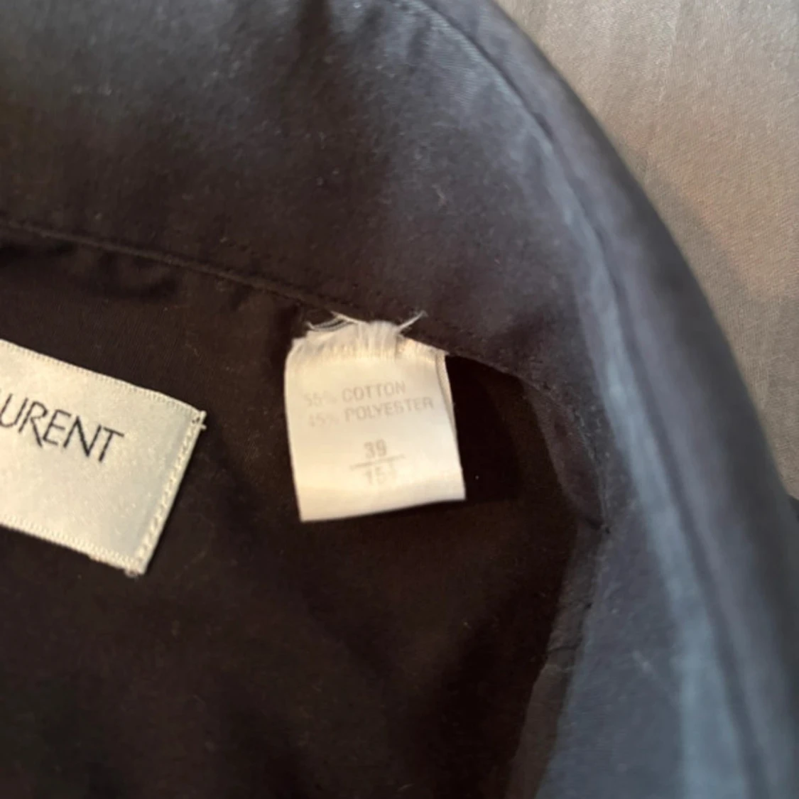 Snygg svart skjorta från Yves Saint Laurent med klassisk krage och knappar hela vägen. Diskret YSL-broderi på bröstet ger en exklusiv touch. Tillverkad i mjuk bomull som känns skön mot huden. Perfekt för dig som gillar stilrena designer och vill ha något från ett ikoniskt märke. Storlek 39, borde passa M-L