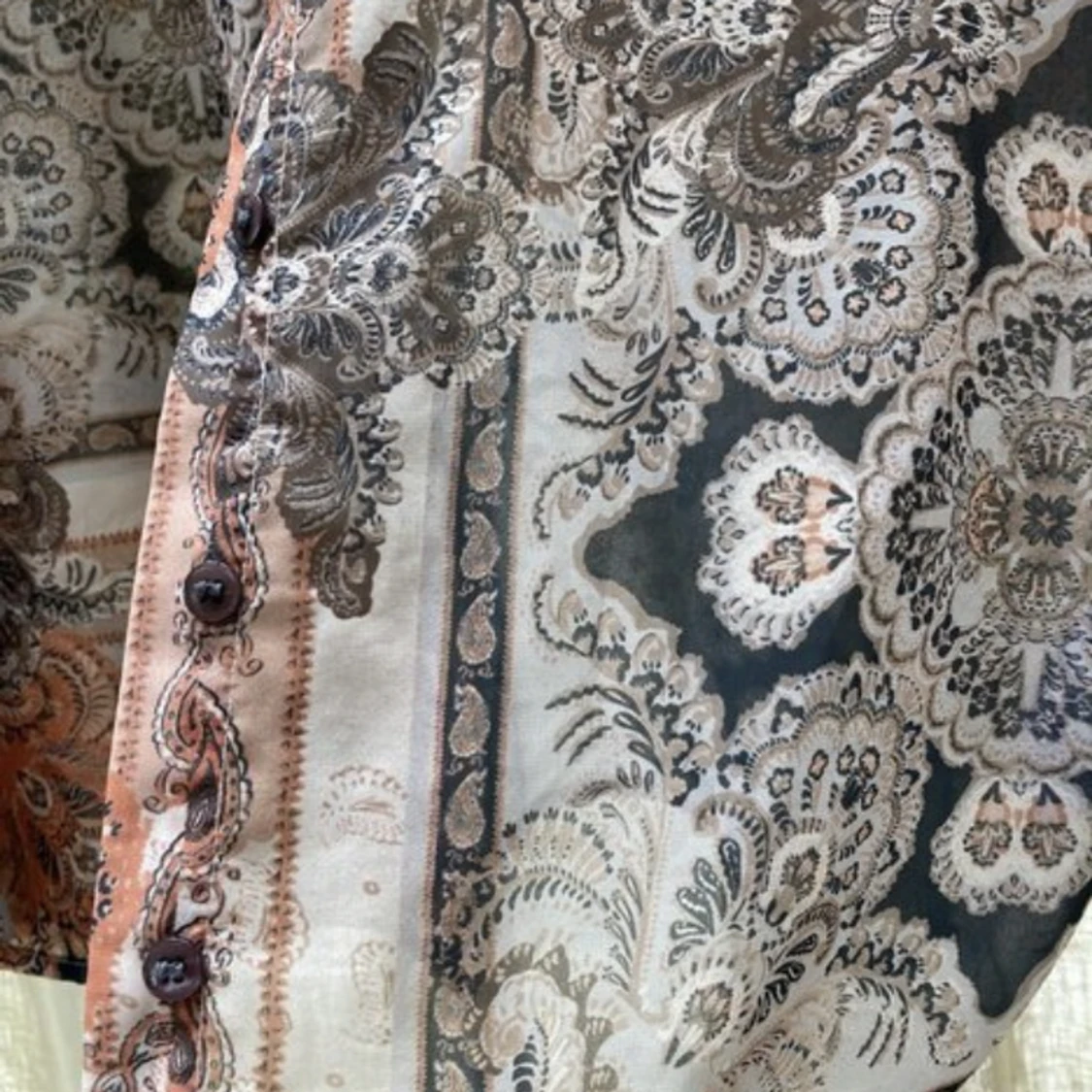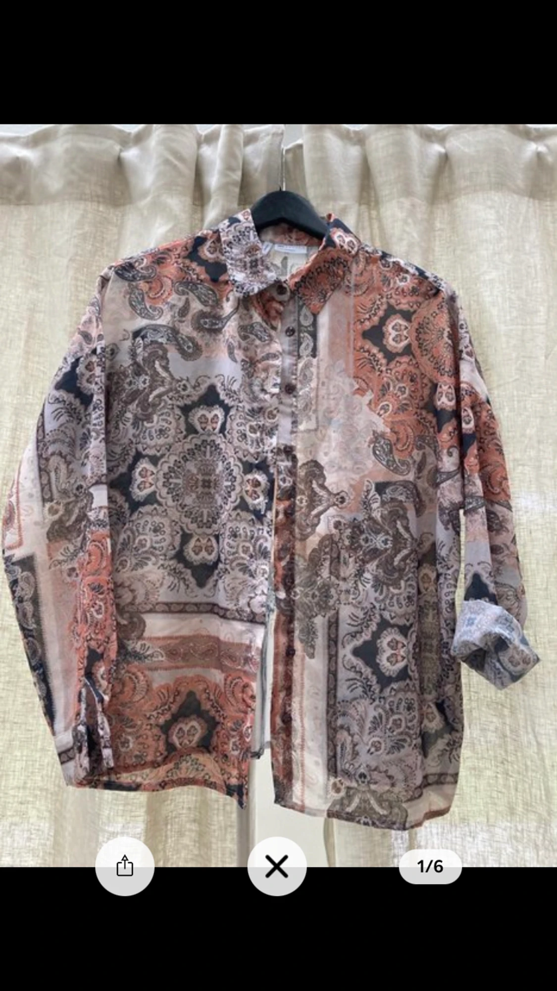 Tunn jättesnygg skjorta i underbart mönster. Behöver inte strykas. Ganska luftig i modellen, nästan lite oversize-känsla. Tyget är lite halv-transparent men man kan utan problem ha linne eller liknande under utan att det syns.