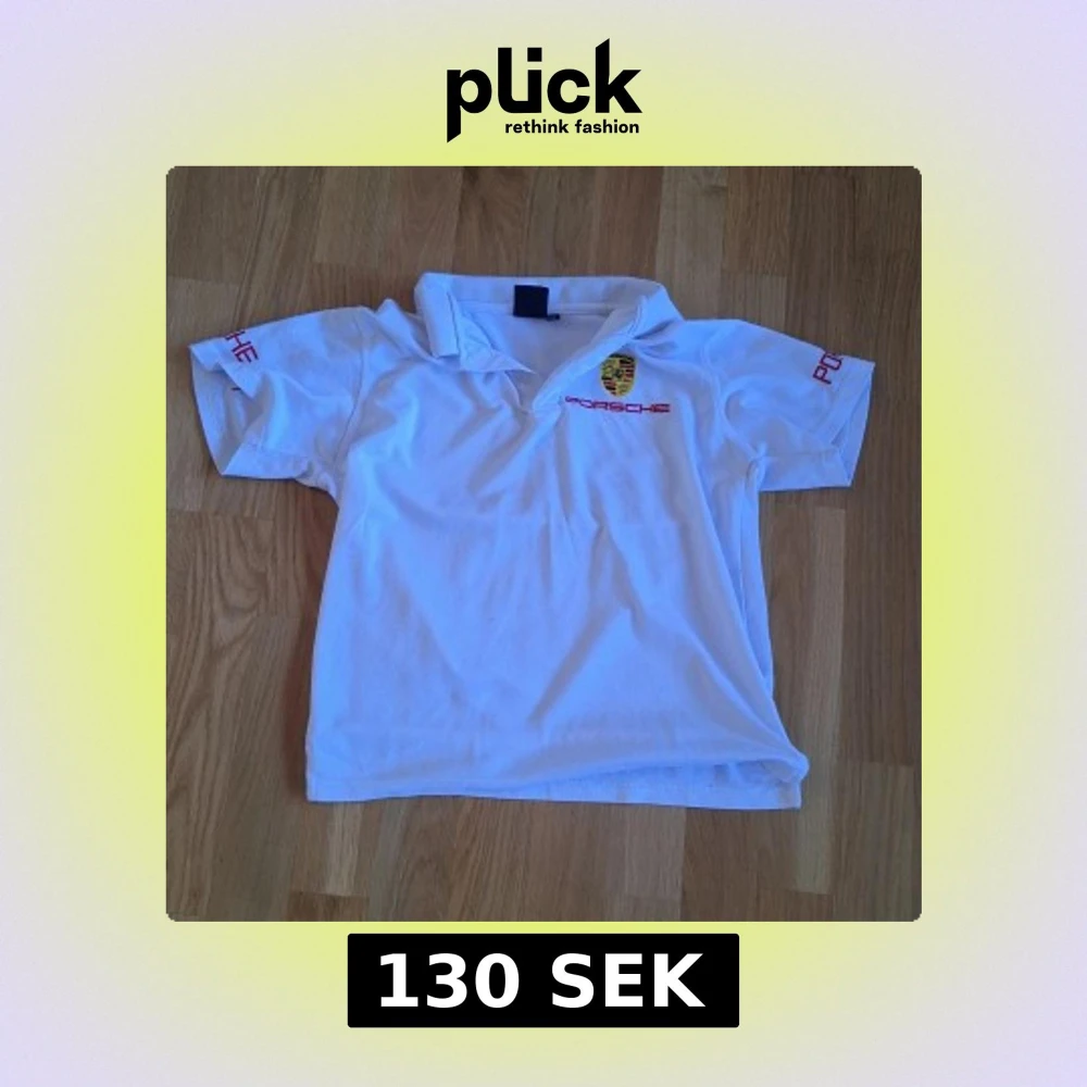 Vit piké från Porsche med klassisk krage och broderad Porsche-logga på bröstet och ryggen. Röd text på ärmarna och framtill. Skön passform och sportig look, perfekt för dig som gillar bilar och snygga märkeskläder. Pris kan såklart diskuteras!