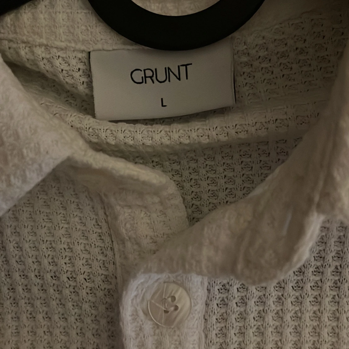 Säljer en vit skjorta från Grunt i storlek L i barn storlek(ungefär xs i herr storlek). Skjortan har ribbad struktur, klassisk krage och knäppning framtill. Perfekt för dig som gillar en stilren och enkel look i sommar. Långa ärmar och mjukt material.