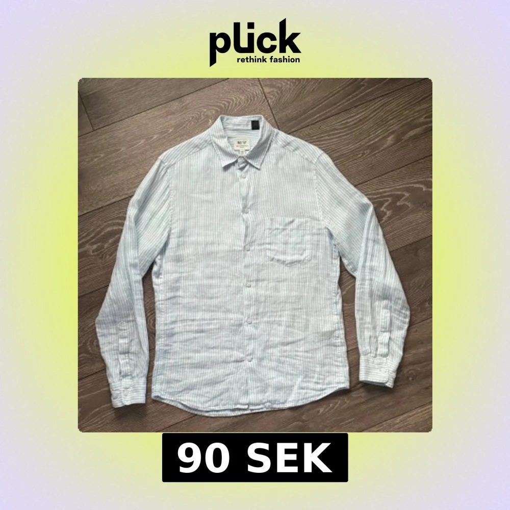 Säljer en fräsch ljusblå och vit randig skjorta från H&M Essentials, modell No 17. Skjortan har klassisk krage, långärmad design och en bröstficka. Regular fit och tillverkad i mjukt linne, perfekt för en chill och stilren look.