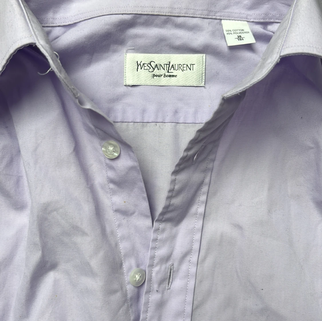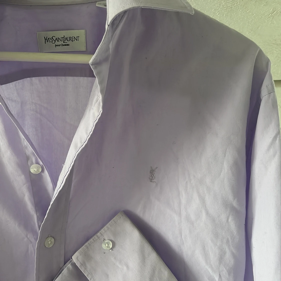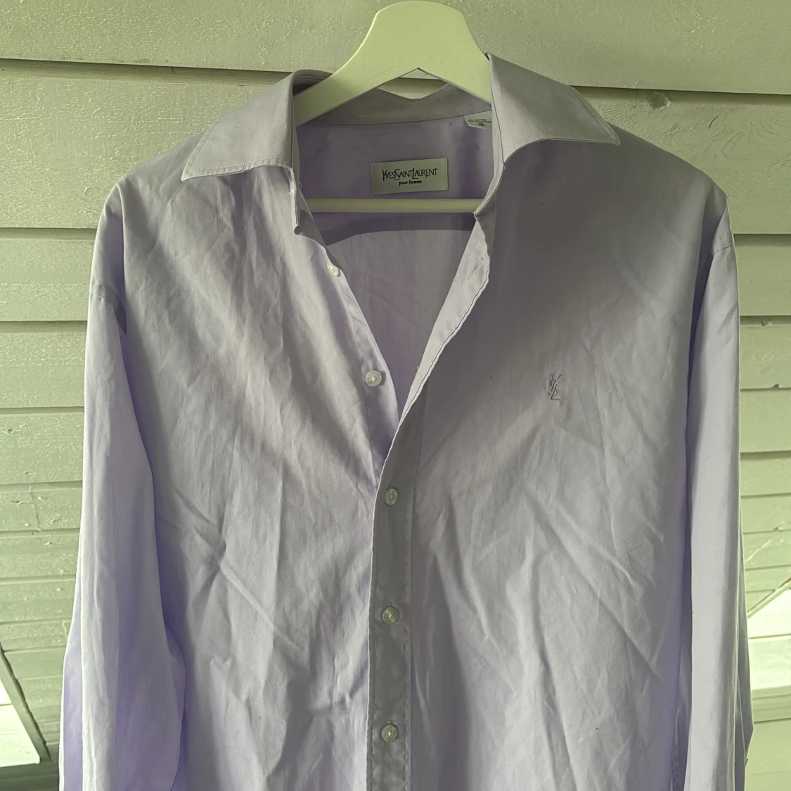 Säljer en stilren ljuslila skjorta från Yves Saint Laurent med klassisk krage och diskret YSL-broderi på bröstet. Skjortan har långa ärmar och knäppning framtill. Perfekt för dig som gillar en clean och exklusiv look. Den är i mycket bra skick, använd ca 4 gånger. Enda defekten är att kragen längst ut på armen gått upp lite (syns på sista bilden) storlek M Hör gärna av er vid frågor och funderingar!