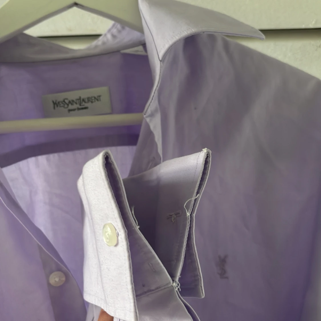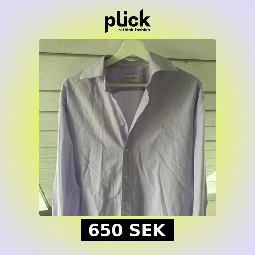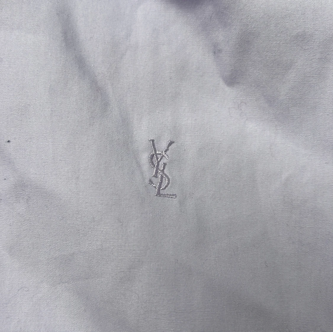 Säljer en stilren ljuslila skjorta från Yves Saint Laurent med klassisk krage och diskret YSL-broderi på bröstet. Skjortan har långa ärmar och knäppning framtill. Perfekt för dig som gillar en clean och exklusiv look. Den är i mycket bra skick, använd ca 4 gånger. Enda defekten är att kragen längst ut på armen gått upp lite (syns på sista bilden) storlek M Hör gärna av er vid frågor och funderingar!