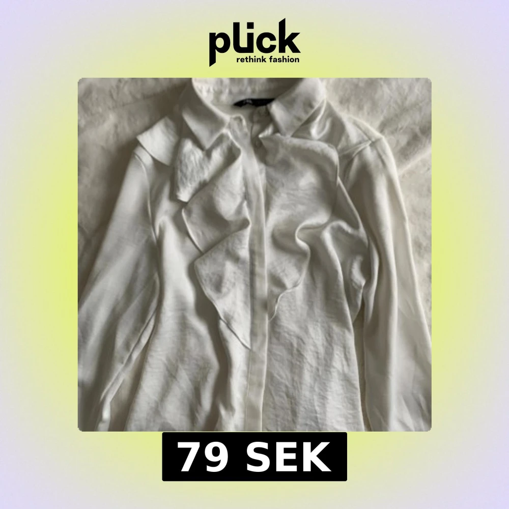 Supersnygg vit blus från Zara med volangdetaljer framtill och pärlknappar vid hals och ärmslut. Klassisk krage och långärmad modell i ett mjukt, lätt material som känns lyxigt. Perfekt för dig som gillar stilrena men ändå unika plagg.