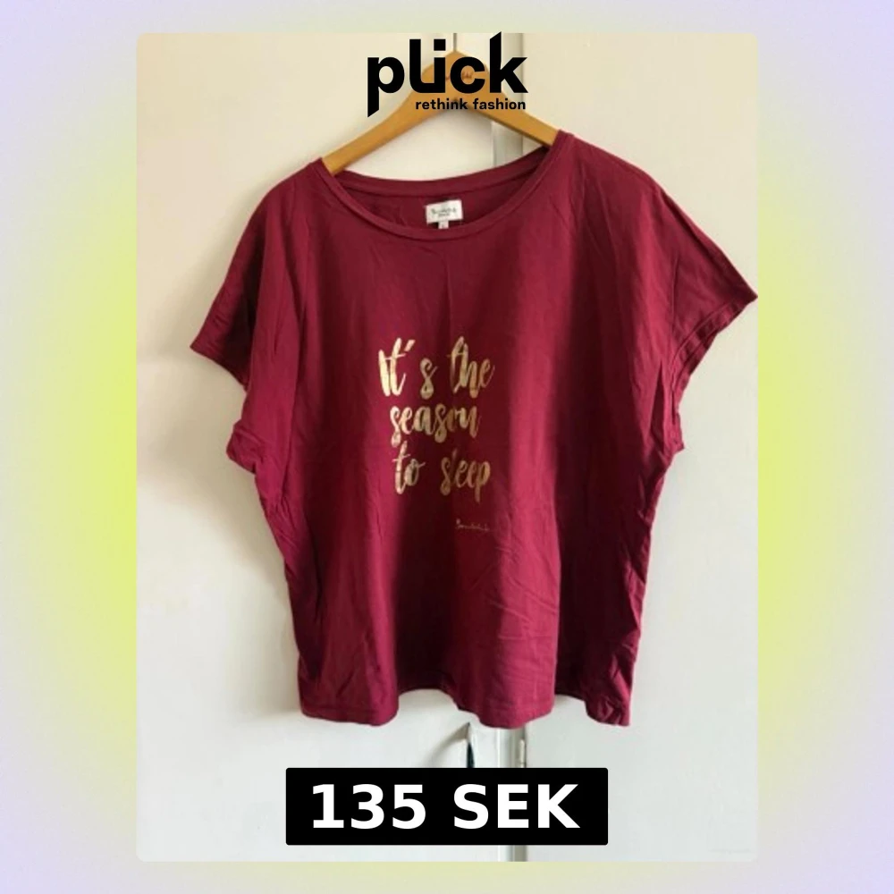 Mysig vinröd pyjamastopp från Bandelid med korta ärmar och rund halsringning. Framsidan har ett tryck i guld med texten 'It's the season to sleep'. Perfekt för slappa dagar och nätter. Materialet känns mjukt och bekvämt mot huden.