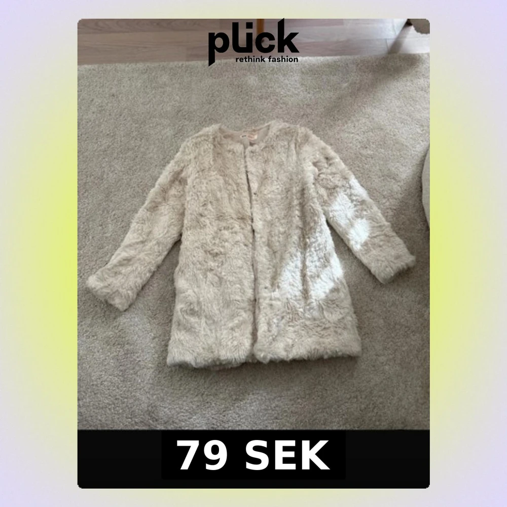 Säljer en krämvit fuskpälsjacka med rak passform och rund halsringning. Jackan har långa ärmar och stängs framtill. Perfekt för dig som vill ha en mysig och trendig look under kalla dagar.