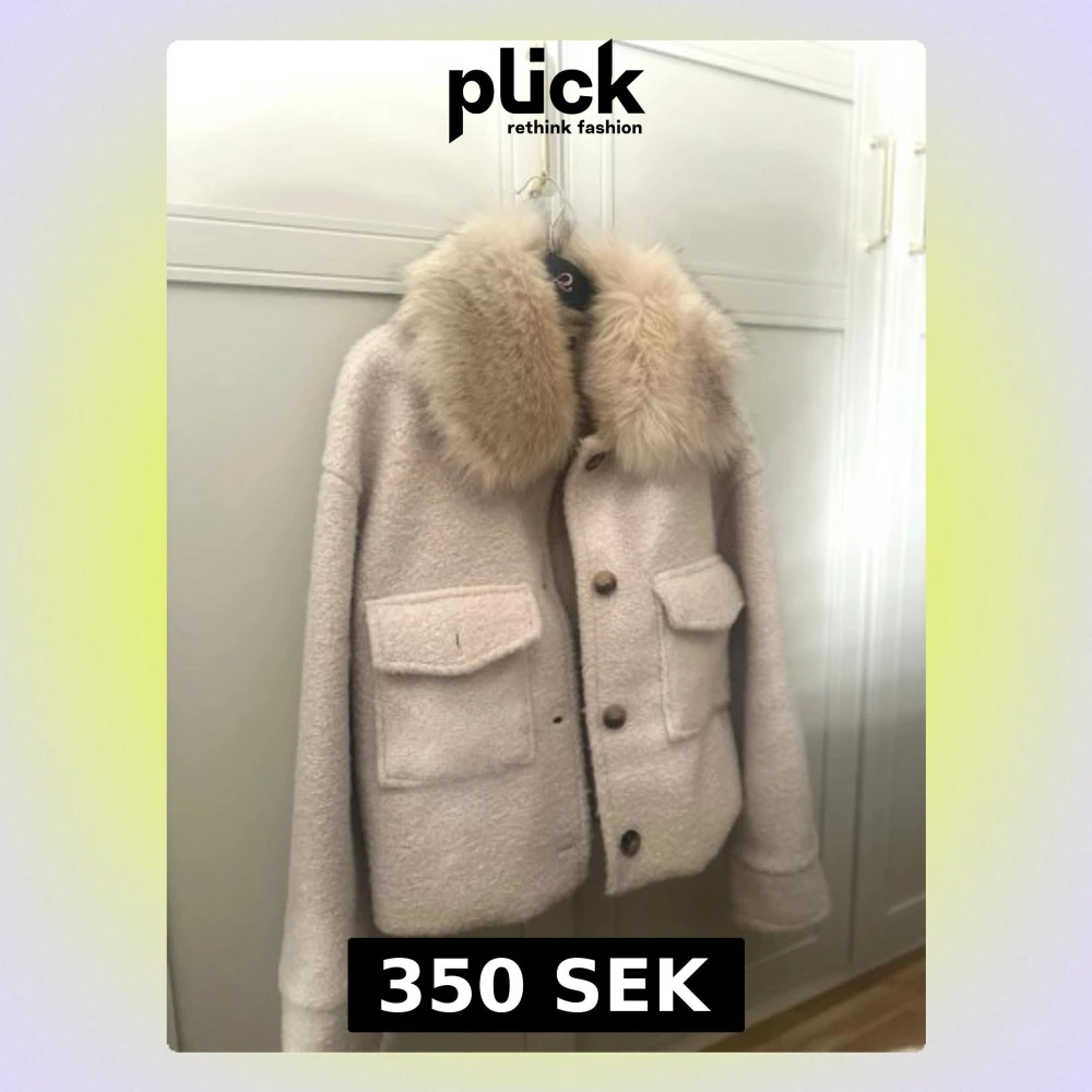 Säljer en beige pälsjacka med stor fluffig krage i fuskpäls och två stora fickor framtill. Onesize