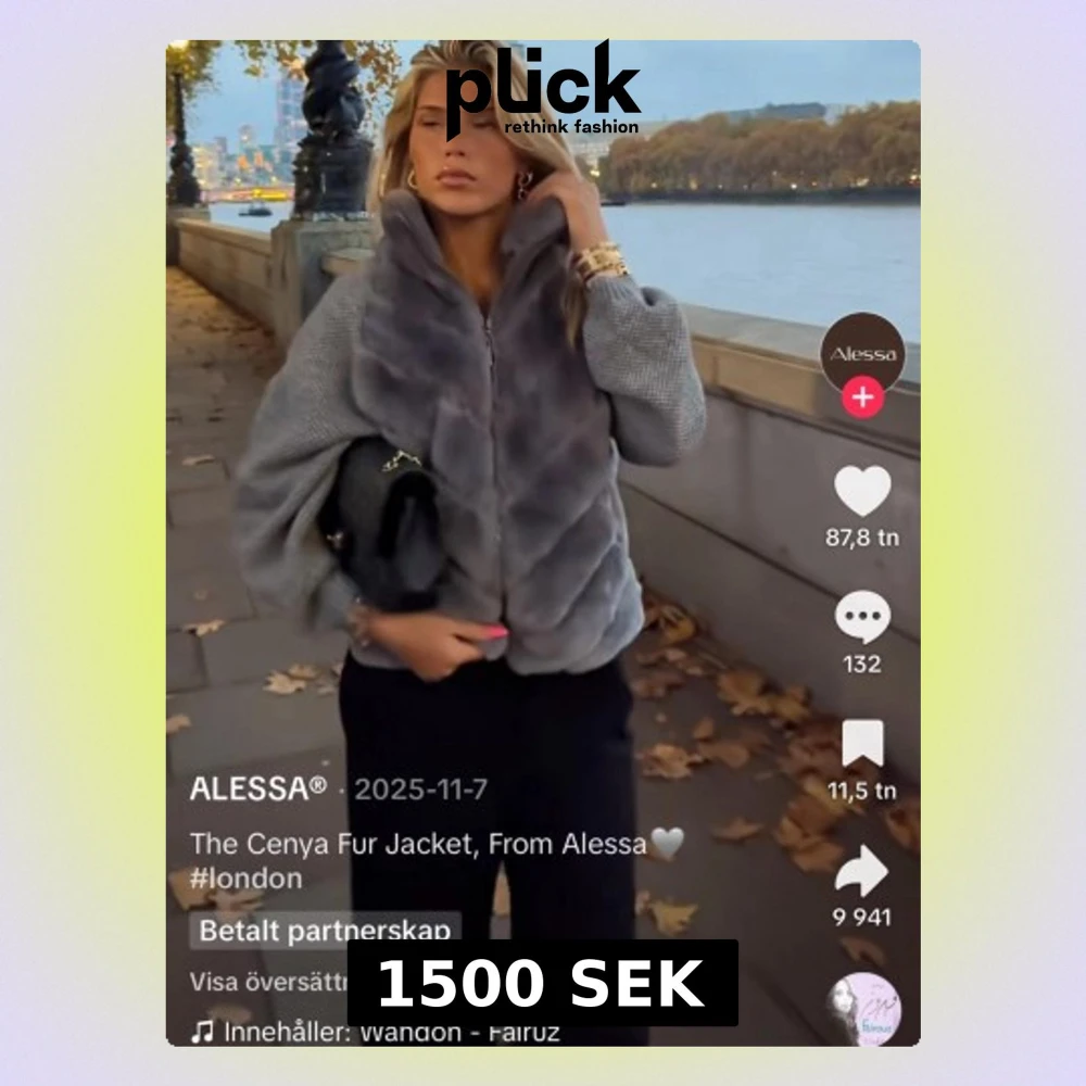 Snygg brun pälsjacka med dragkedja framtill och hög krage. Framsidan och ryggen är i mjuk fuskpäls med ett chevronmönster, medan ärmarna är stickade i matchande brun ton. Jackan har ribbade muddar vid ärmsluten för extra komfort. Alessa, kostar 4000kr ny