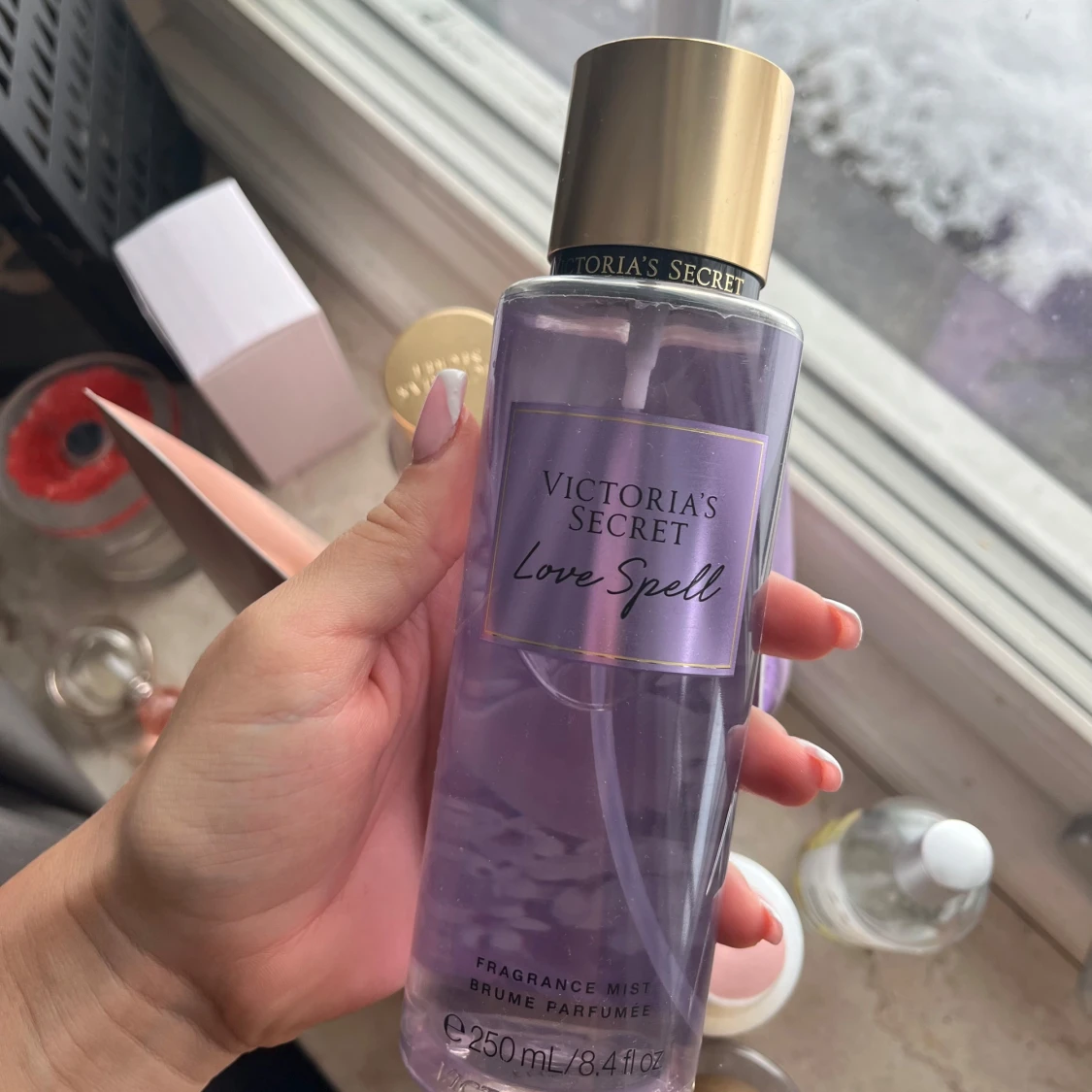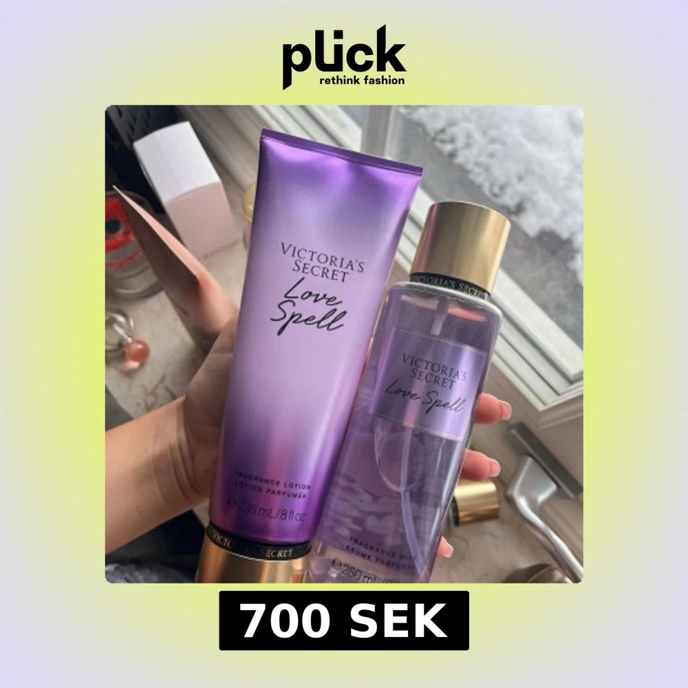 Säljer ett parfymset från Victoria's Secret med doften Love Spell. Setet innehåller en fragrance mist på 250 ml och en lotion på 236 ml. Båda produkterna har en lila förpackning med guldiga detaljer och ger en fräsch och blommig doft.