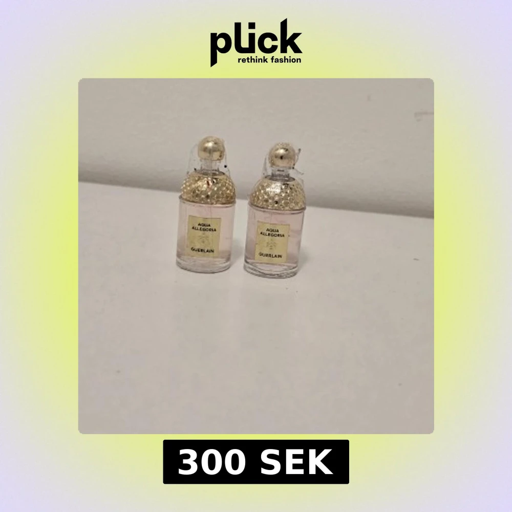 Två små flaskor Guerlain Aqua Allegoria parfym med ljusrosa vätska. Flaskorna är genomskinliga med guldig bikakemönstrad kork och rund topp. Snygg och lyxig design som känns exklusiv och elegant.